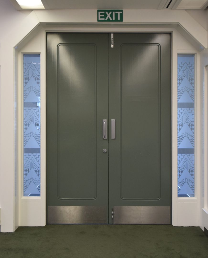 Anthony Pene, ‘Sandblasted Panels’, Entrances to Courtrooms 2, 3 & 4 [showing 2], High Court, Te Whanganui-a-Tara Wellington. Images: Bronwyn Holloway-Smith, Public Art Heritage Aotearoa New Zealand, 2024