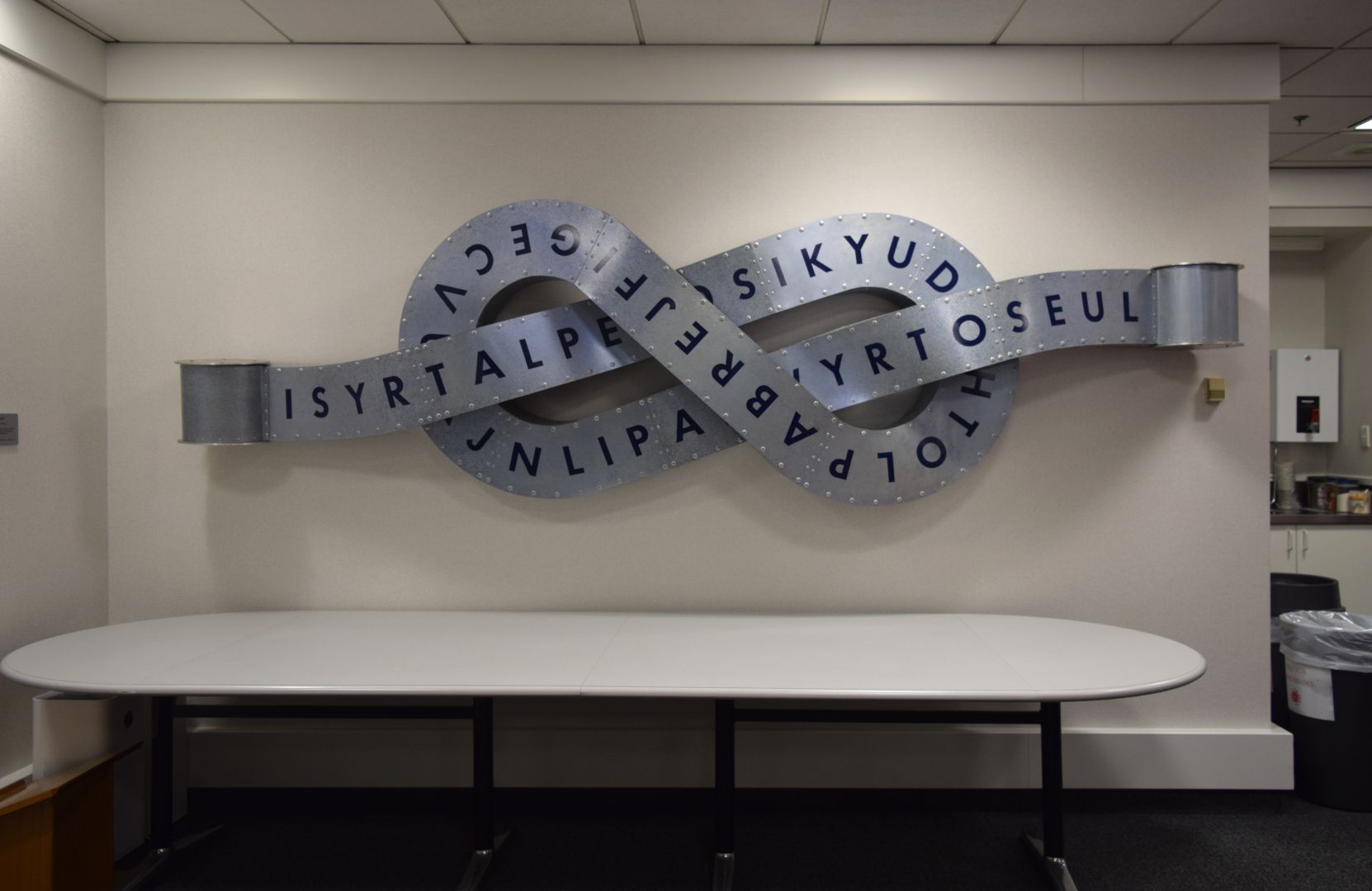 “Alphabeti is a galvanized sheet-box construction using pop rivets. The sculpture’s form intertwines and wraps around itself. Upon this letter loop is a random sequence of alphabet letters.