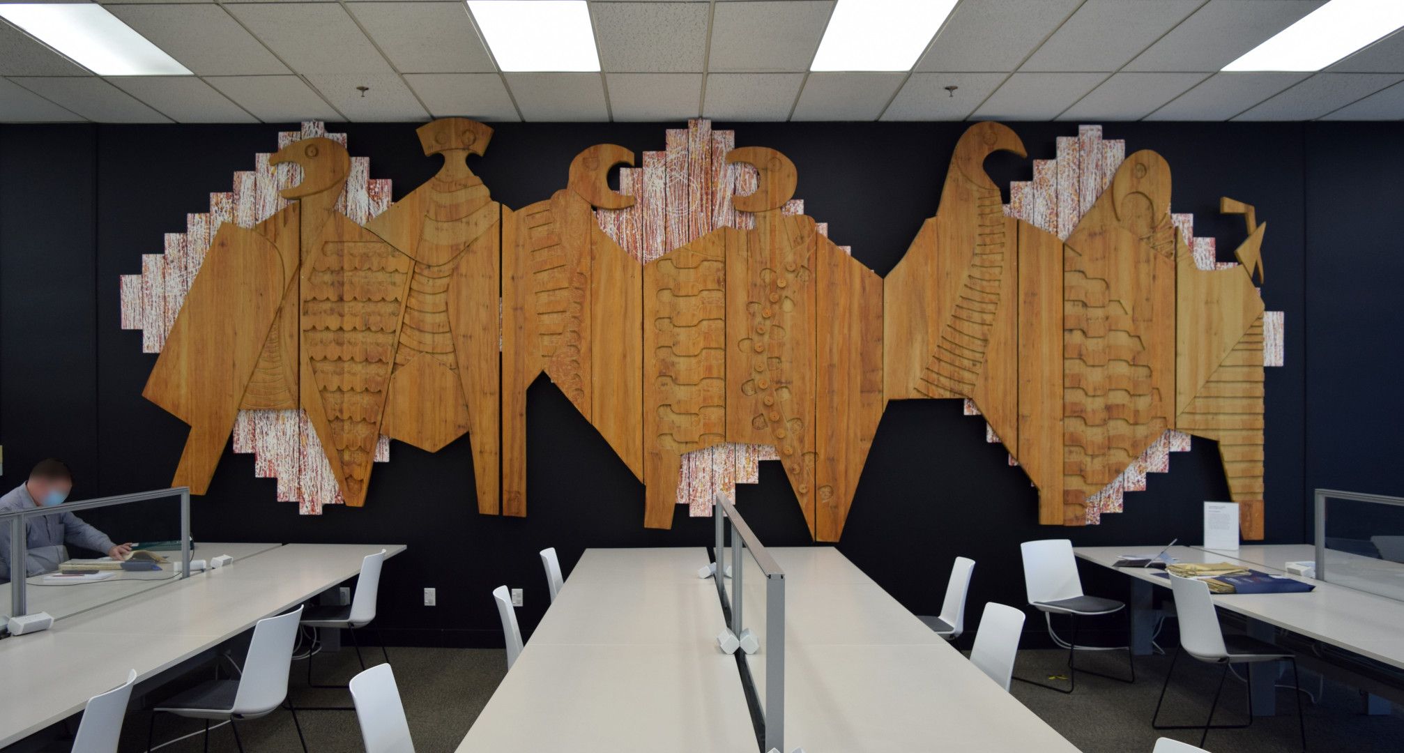 'Kai a te Rangatira' represents the progression of an idea from discussion to recording. The works’ inspiration comes from the saying: "Tā te rangatira, tāna kai he kōrero" (speech is the food of a chief). The first of the three panels symbolises the formation of a concept or idea; the second panel the discussion of the idea; and the third panel the recording of the idea – in other words, how an archive or record is created. The continuous movement of forms suggests figures in discussion, and the figure to the right represents the scribe.”