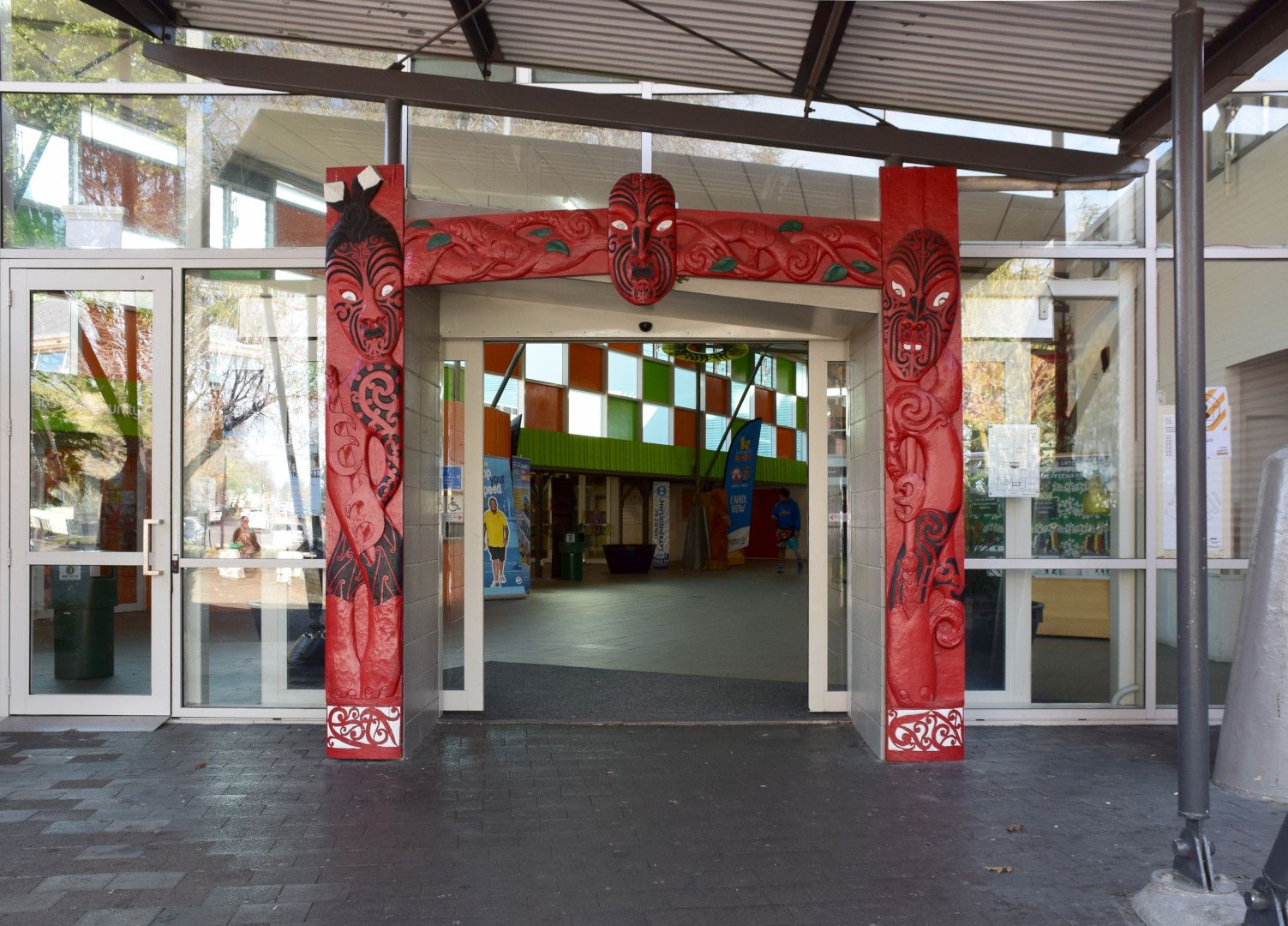 Waharoa to the entrance of the building carved by members of the Aronui Trust, an education and training organisation with campuses at Park Avenue, Ōtahuhu, Papkura, Ramarama and Ōtara.