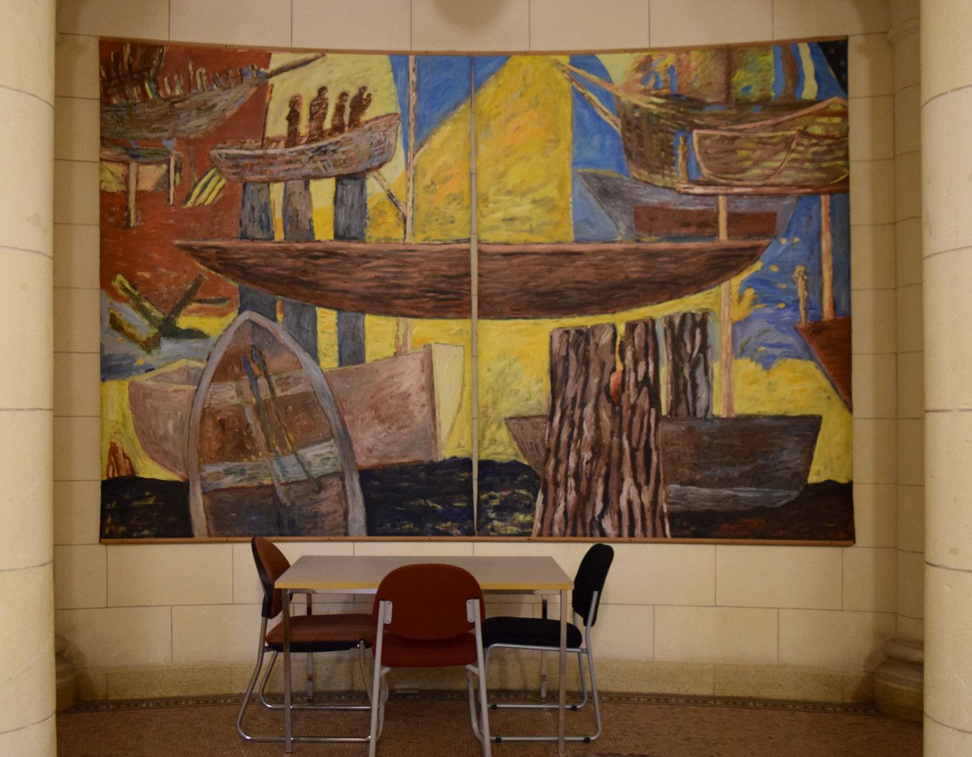 'Sea Piece' is painted as two panels, forming a diptych. In a painterly manner, Barbara Tuck has depicted a series of overlapping images of boats ranging from waka to dinghy. A tree stump indicates the price of these vessels on the landscape, as trees were felled to build them.