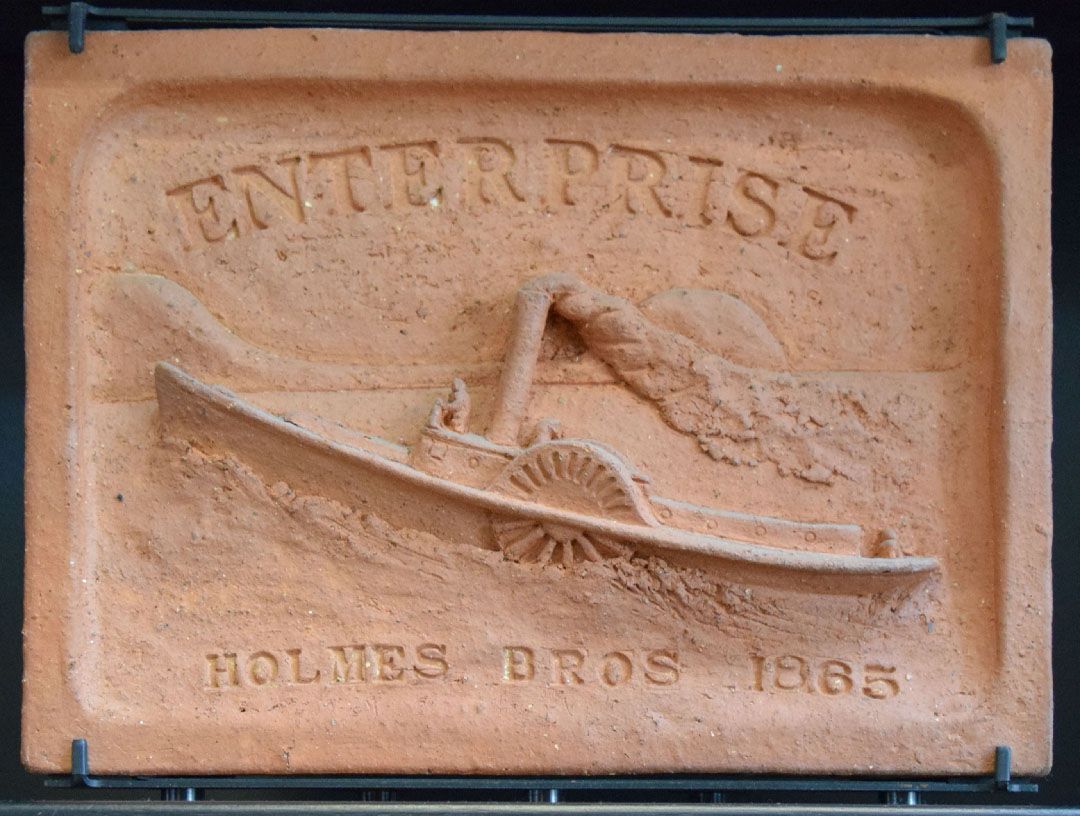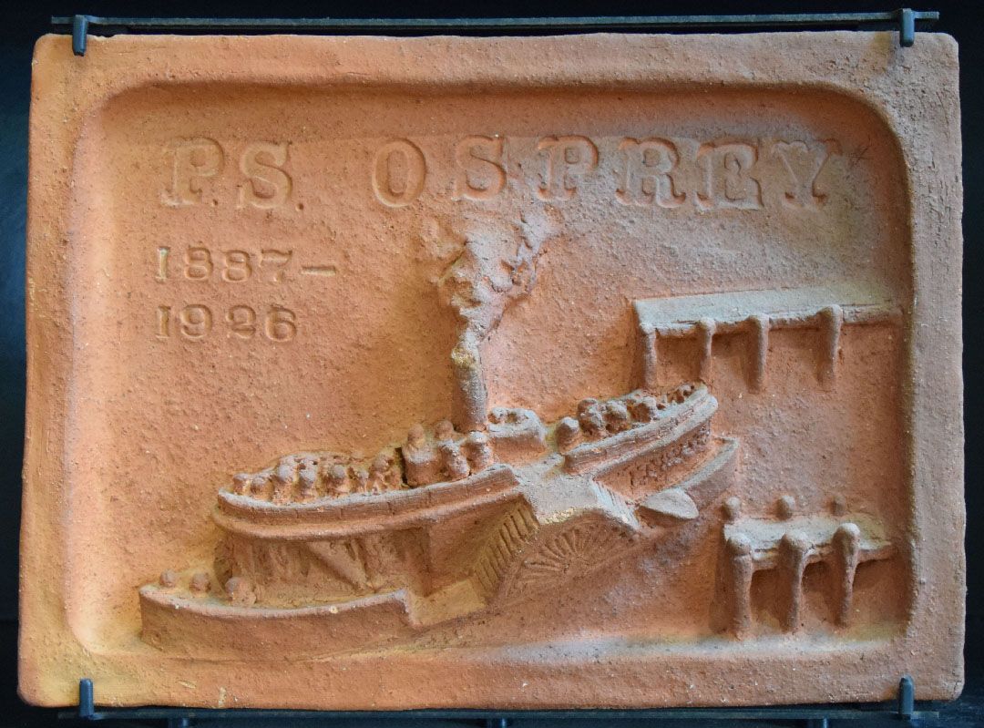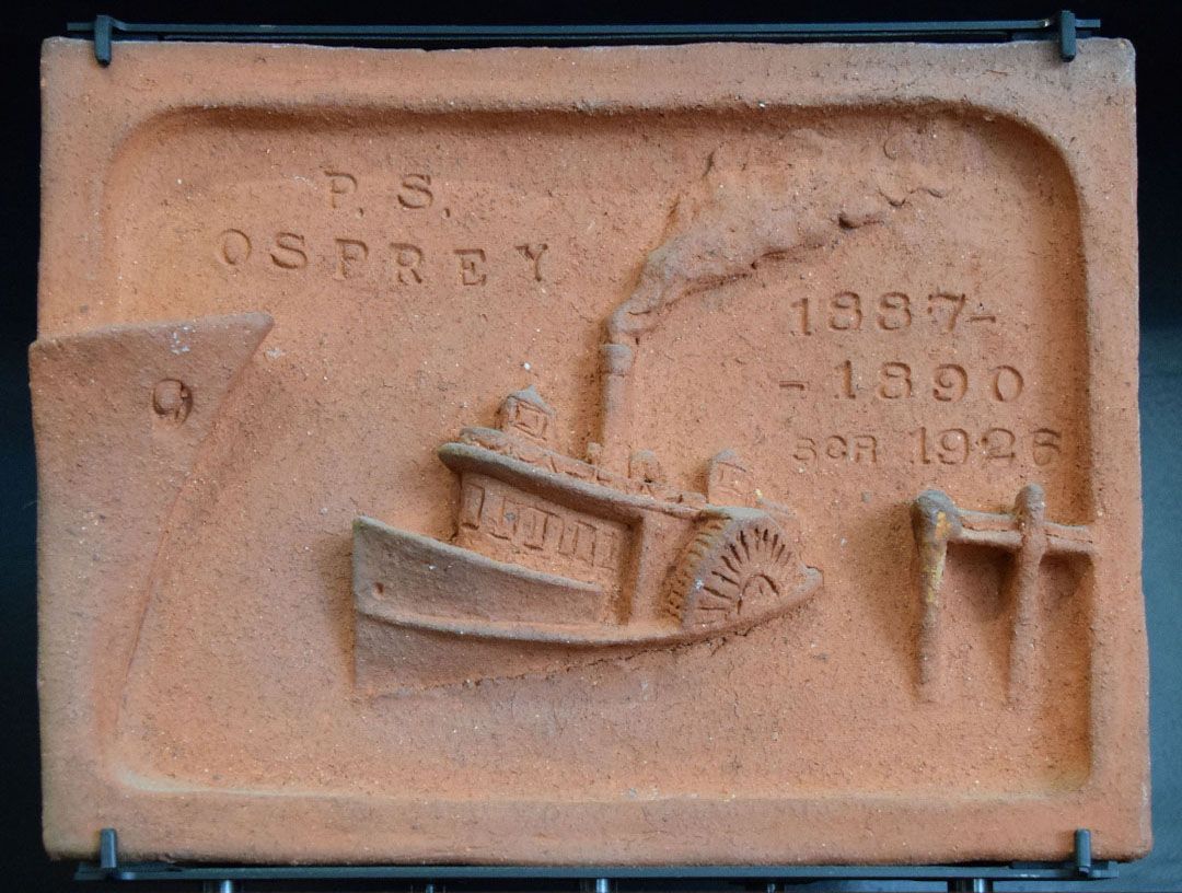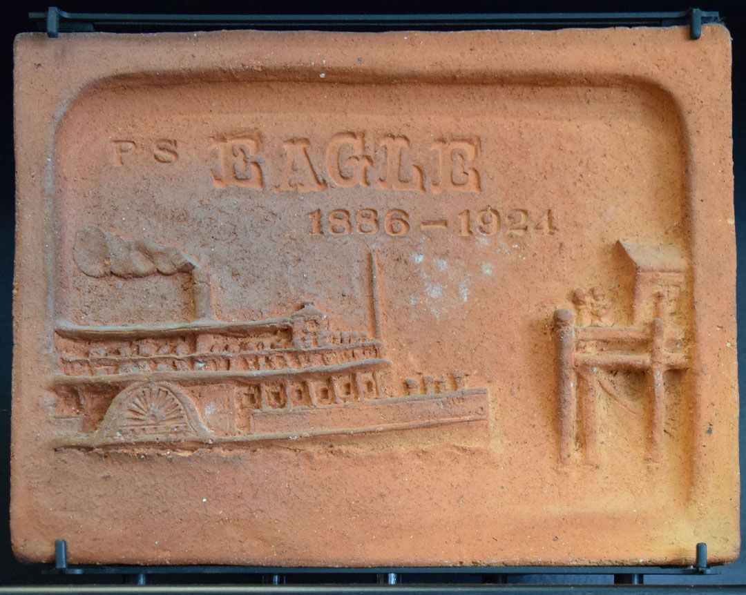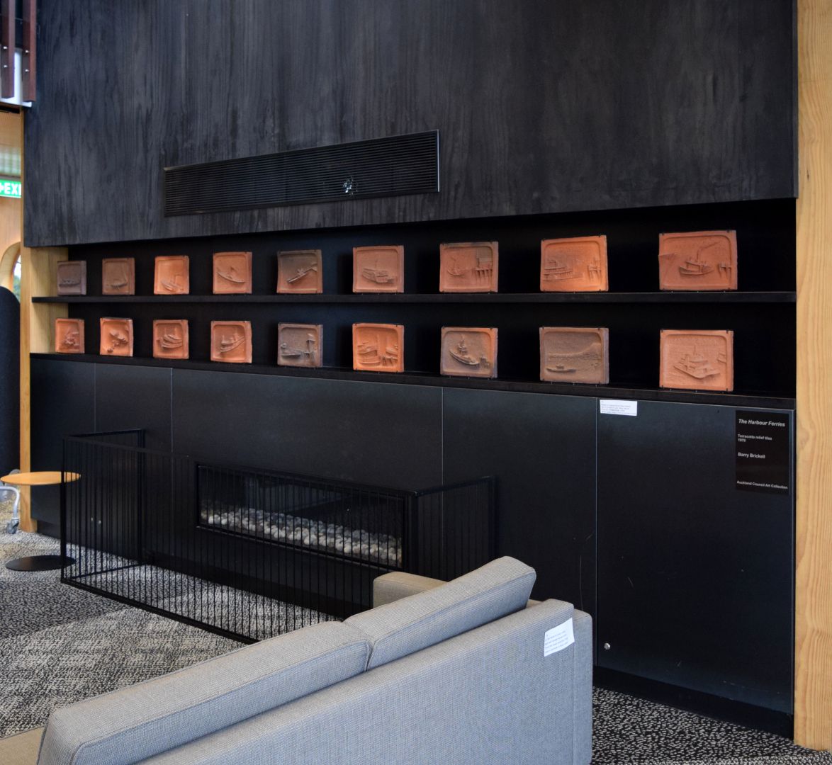Brickell used images in the book ‘Steam on the Waitemata’ by transport historian W. W. Stewart (A. H. & A. W. Reed, 1972) as inspiration for the tiles, which were wood-fired in his kiln at Driving Creek, Coromandel. Following the delivery of the tiles, they sat loosely on top of book cabinets for a decade until the building was completed. During this time one tile was broken, and three others damaged. The council paid for replacement tiles to be made and Brickell used this opportunity to replace the ‘Toroa’ tile with one of the Kea ferry which had recently arrived in the city. This tile was made for Barry by Paul Lorimer. The Toroa tile is now in the collection of the Driving Creek Railways. Upon completion, the full set were installed in a wall in the library’s entrance foyer.