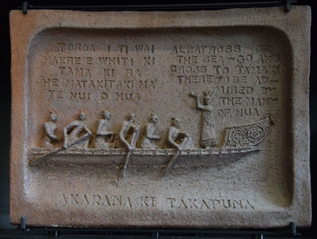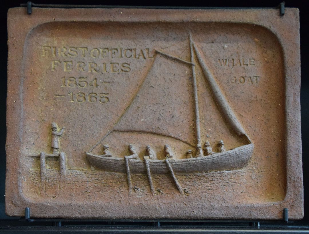 A total of 18 shallow relief sculpted tiles showing the various vessels that have sailed from Te Hau Kapua (Devonport/Torpedo Bay). Beginning with the waka "Akarana ki Takapuna" and concluding with "Sea Bus Kea", a Fuller's Ferry that replaced the long serving Kestrel ferry in 1988.