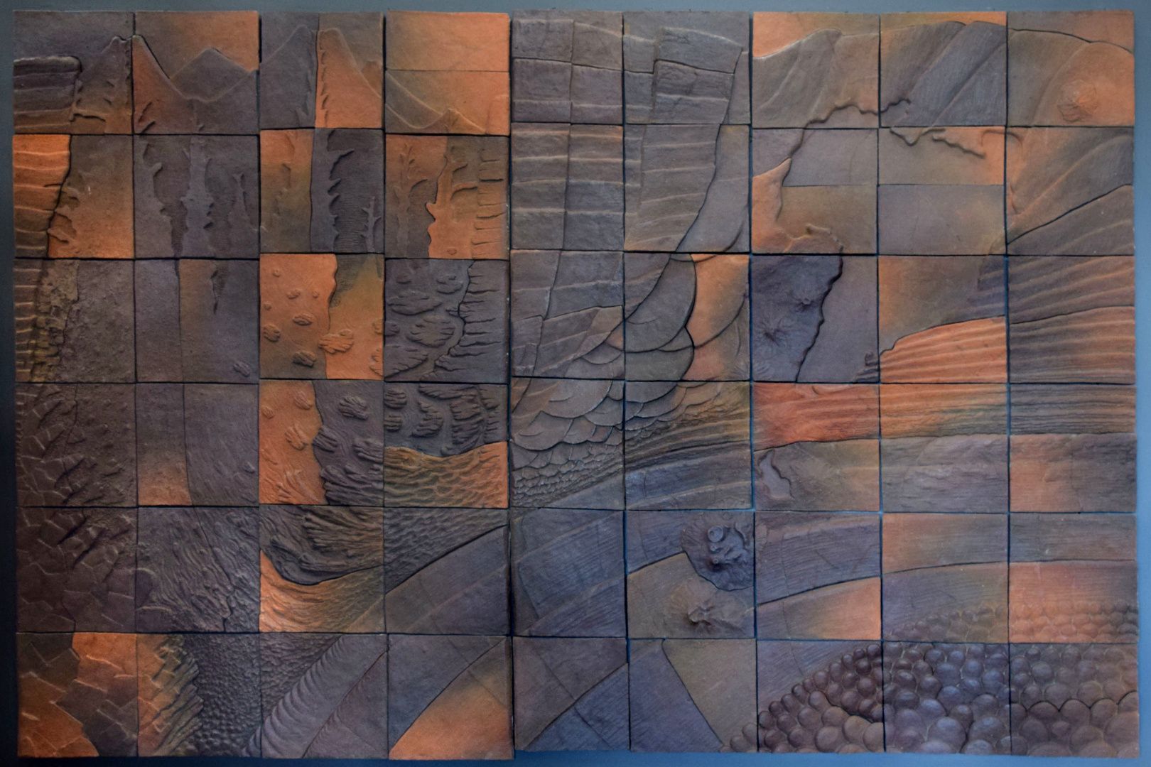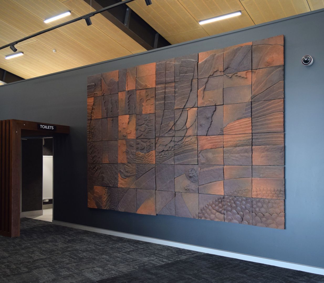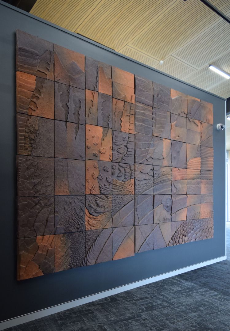 This mural is made of hand-modelled terracotta tiles from mostly Coromandel clay and sand and firedin a wood-fired kiln