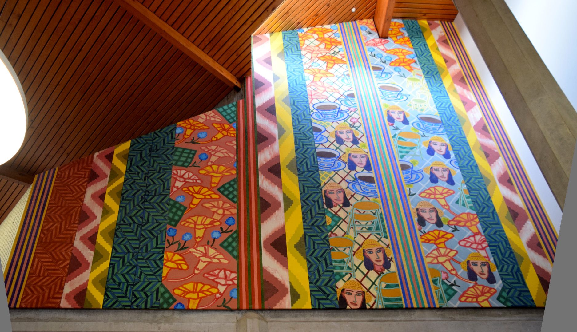 Composition is ordered by strong vertical bands with repeated patterns based on angular geometry: zig-zags and rotated chevrons. Two vertical bands include repetitions of a woman's face, chairs and a cup of tea or coffee.