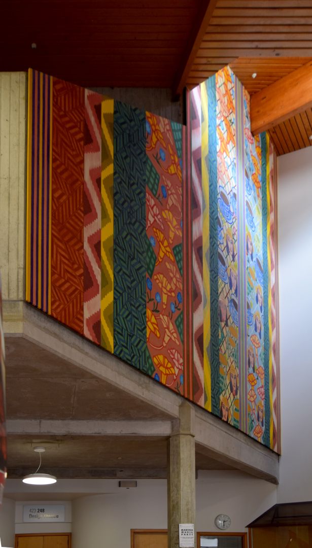 Mural in 5 panels, painted in acrylics on fabric mounted on board.