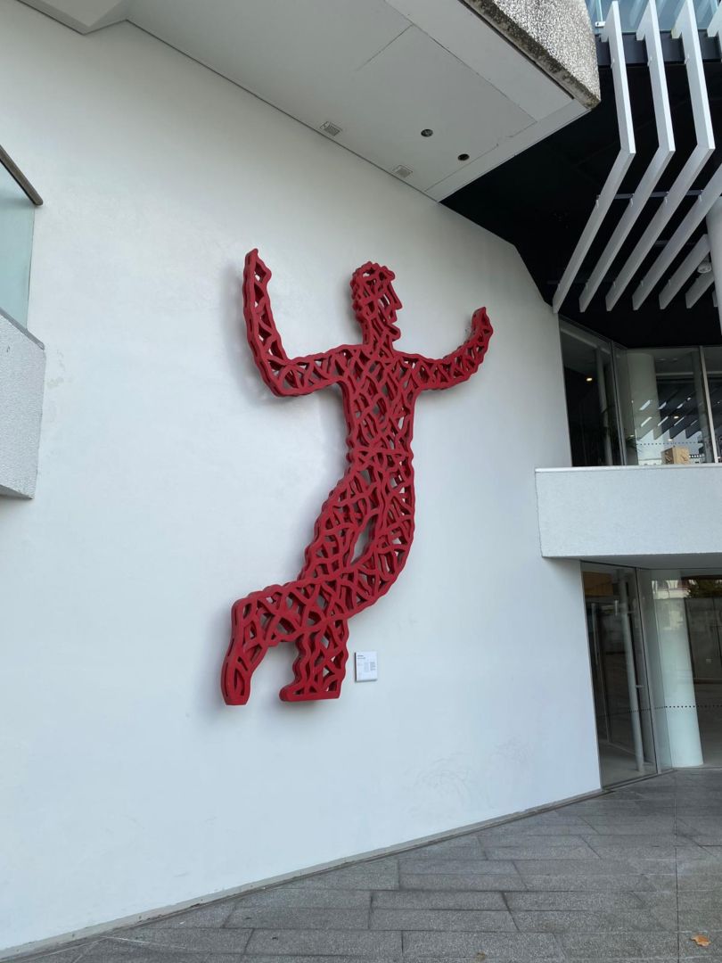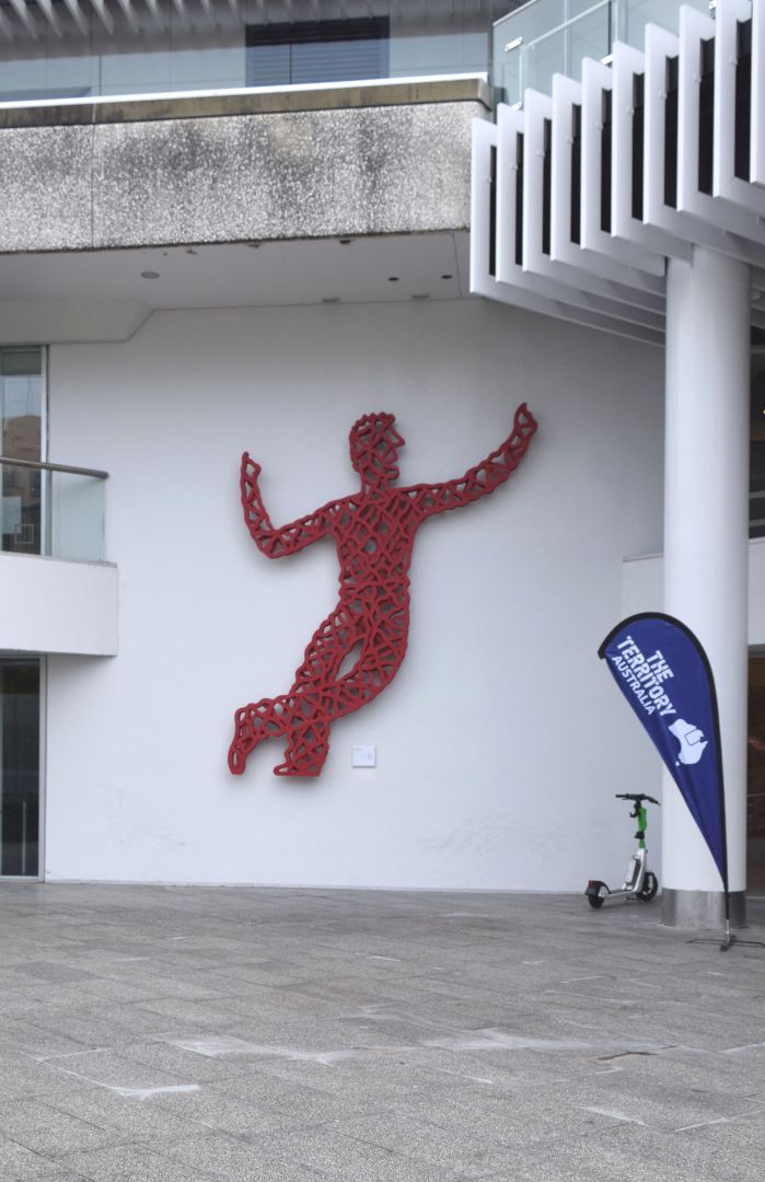 “‘Red Dancer’ is a sculpture by Barry Lett, commissioned as one of a group of works for Aotea Centre. Red Dancer is suspended high on the outside wall of Aotea Centre, adjacent to the level 4 entrance into Aotea Centre, Carter Holt Harvey Lobby. Originally designed as a free-standing sculpture, its present position was suggested by Hamish Keith who coordinated the Aotea Centre artworks.