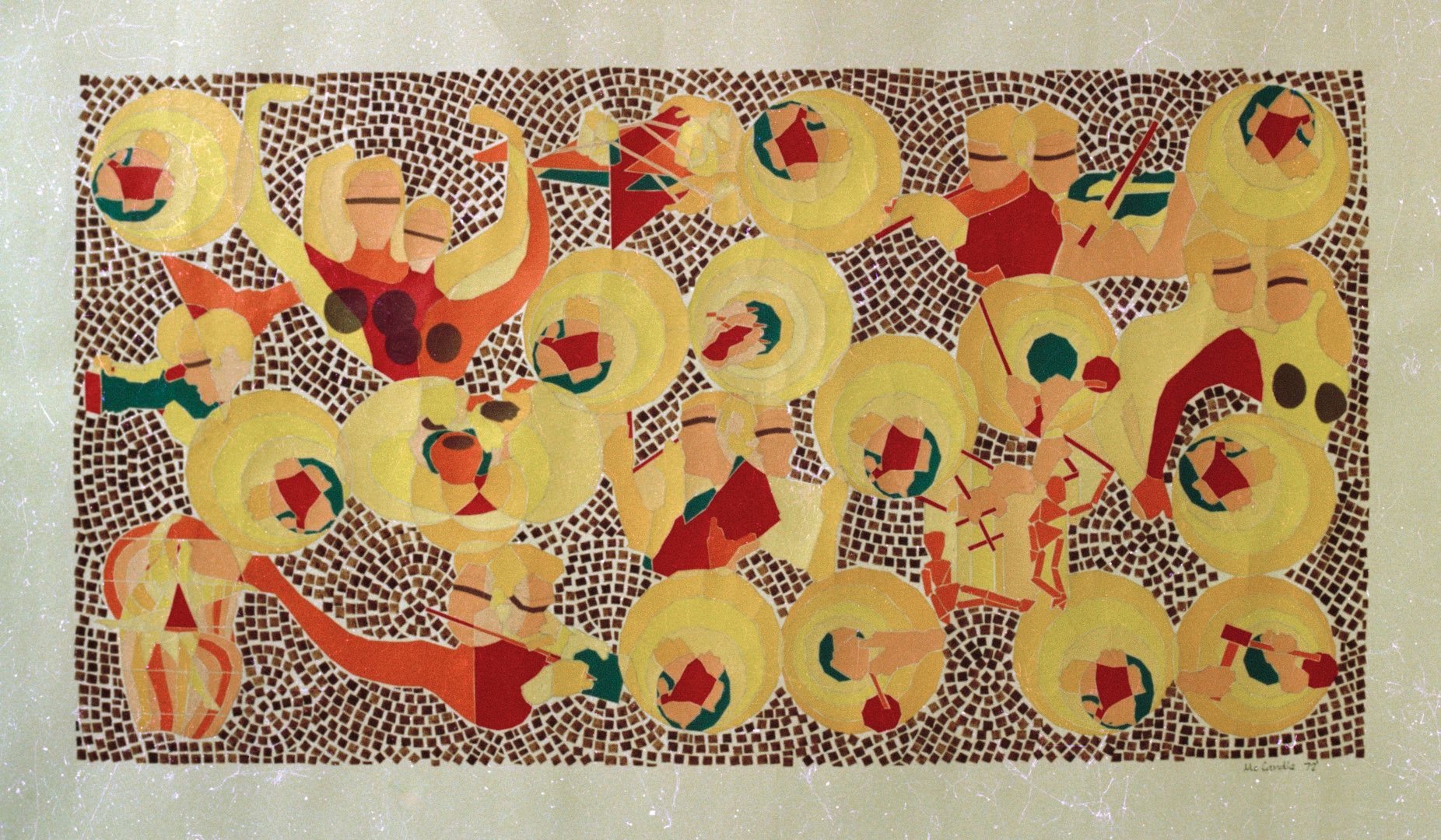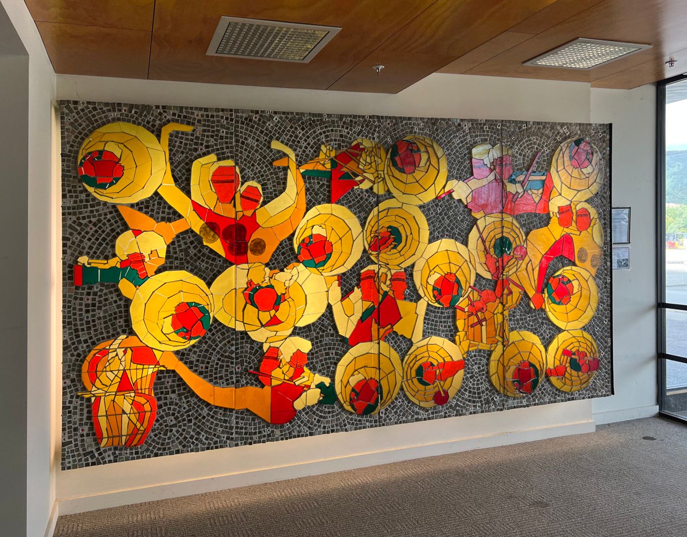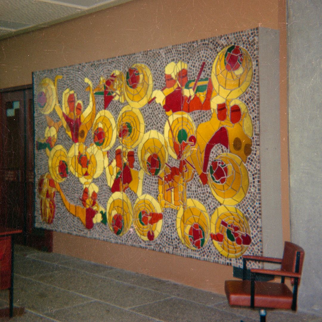 The development of the mural was arranged by the architects and created by Bill McCardle (aka William Wilson McCardle III), who is also recorded as having coordinated the interior design of the whole complex in consultation with the architects.