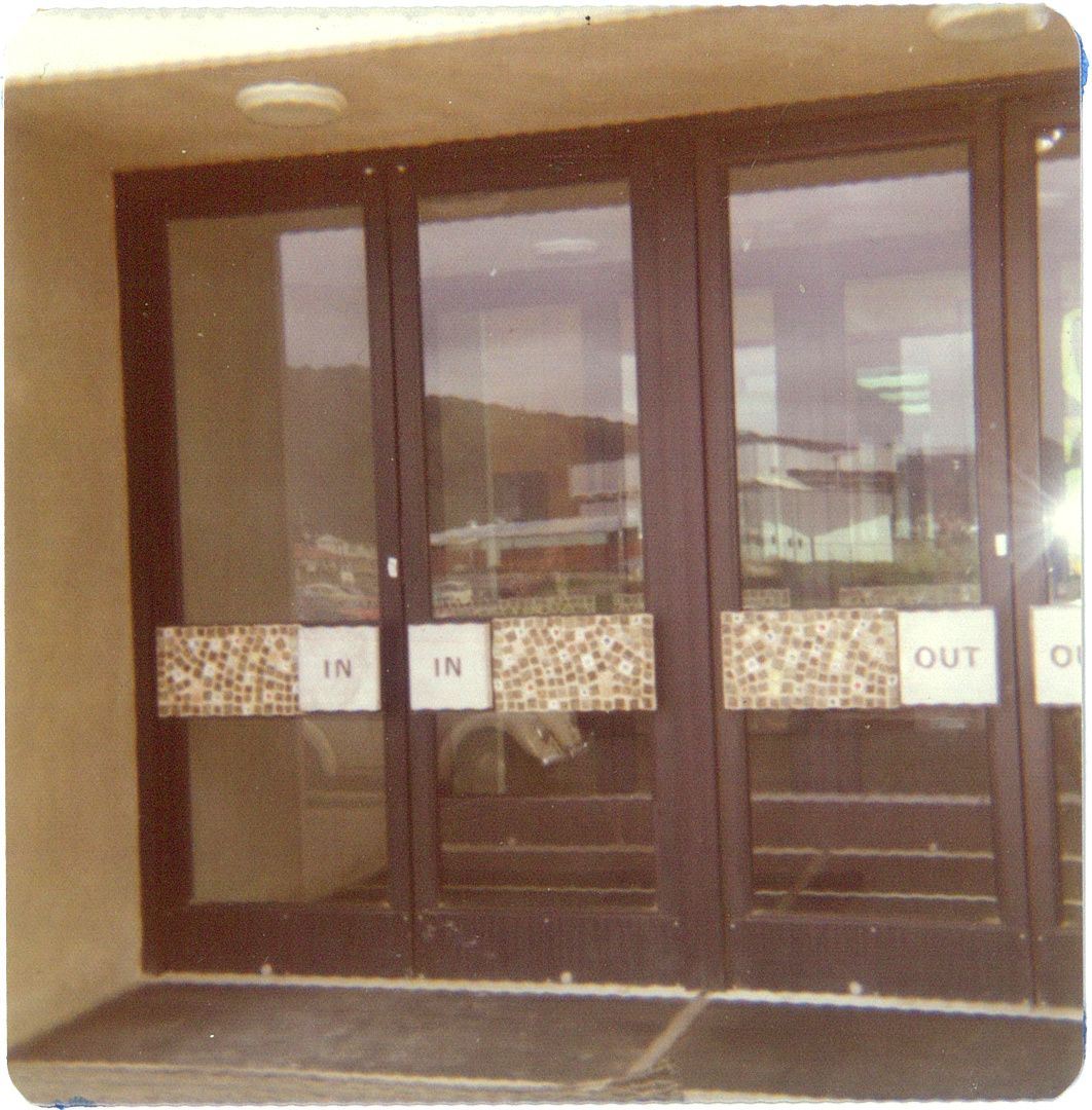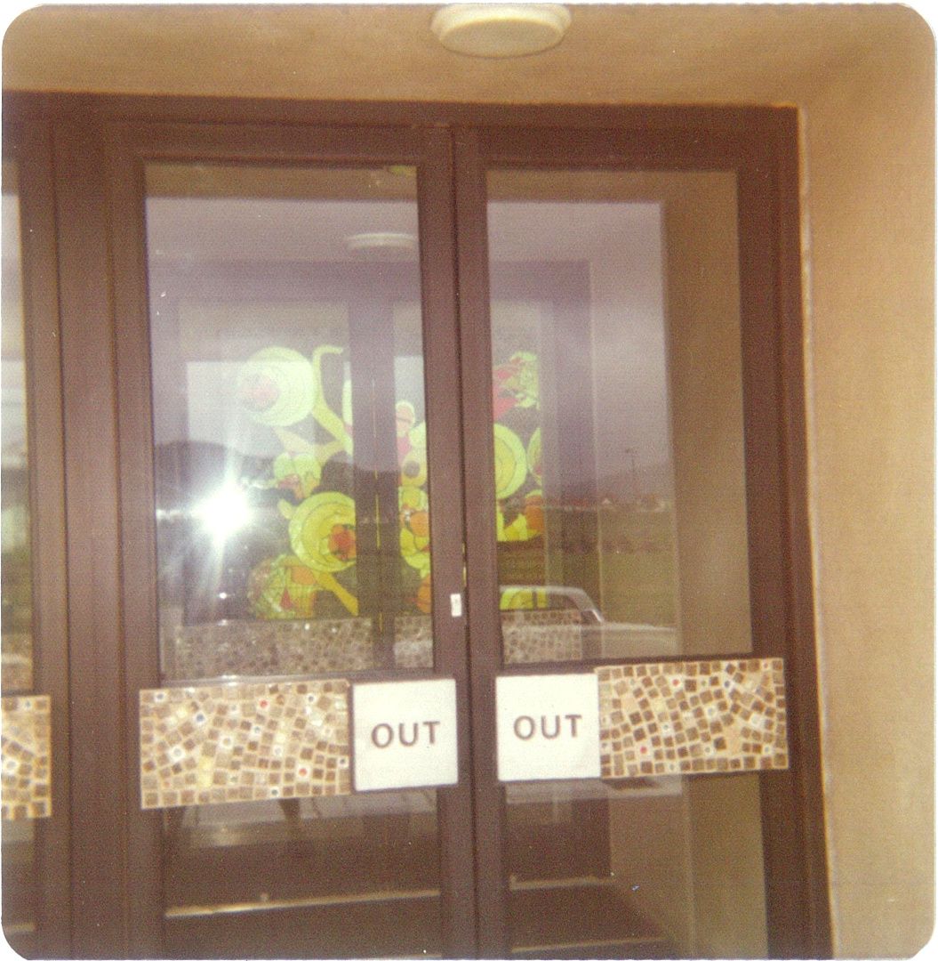 Made of four larger-than-human-scale panels, and illuminated from behind, McCardle’s mural could be said to have radiated with the energy of possibility that Avalon represented. The 7/8 inch thick coloured plate glass was imported from France and cut on site by L. Sharp and L. Gorland, and the ceramic mosaic tiles are thought to have been made by McCardle himself (although speculation exists that Roy Cowan was somehow associated with the project). Similar tiles were also mounted on the main Entrance and Exit doors of the Administration Block. A set of ceramic pillars were also installed in the building, possibly made by Roy Cowan.