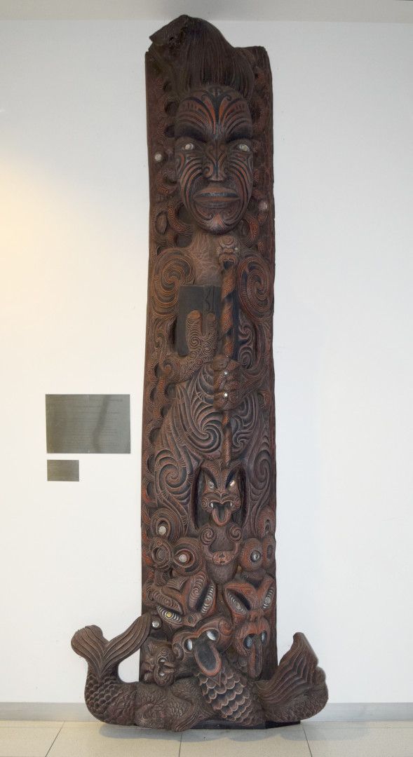 "Tāwhaki was a celebrated hero of Polynesia, sometimes appearing as a mortal and sometimes as a deity, but generally having supernatural powers and being depicted as gracious and generous. His fame enabled him to marry Tangotango, a celestial maiden who quarreled with him and fled back to her heavenly home, with their child. He set out with his brother Karihi to find her, looking for the vine which would help him to find his family. Matakerepo, a blind ancestress showed him the way after he had restored her sight. In the carving, Tawhaki is shown grasping the vine with the bolt of lightning - the symbol of his divinity impressed upon his being. He is believed, by some tribes, to have brought the gifts of knowledge and religion to mankind, from the tenth realm of Rehua."