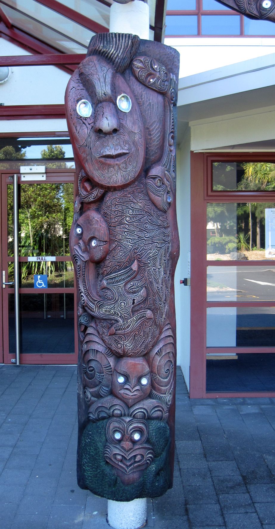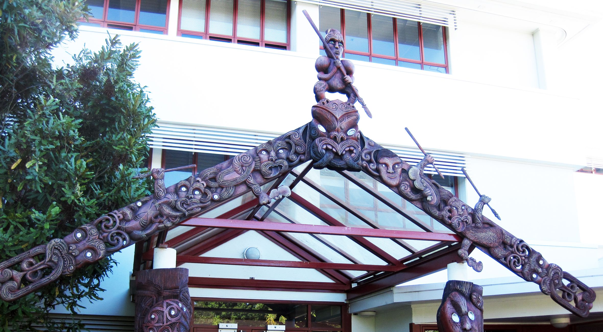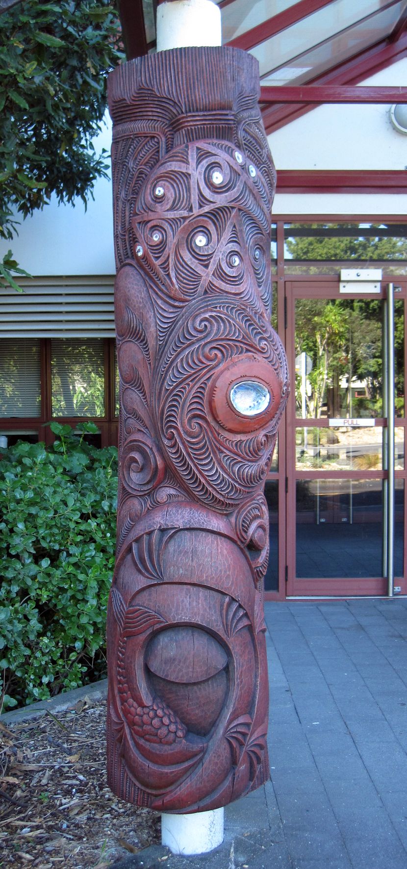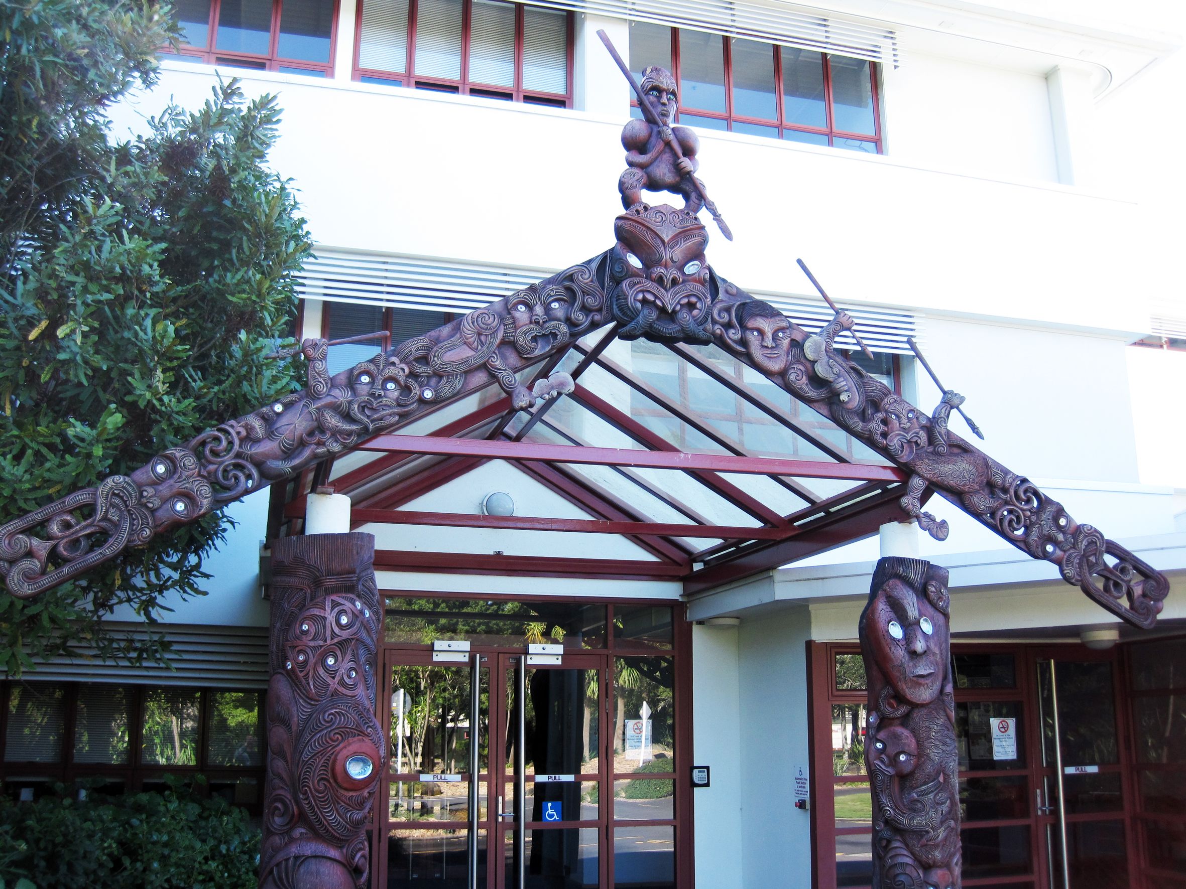Carved tōtara entranceway with tekoteko depicting Raupapa at the apex. The left panel represents the entrance to the seat of learning, and the right panel represents progress toward a pinnacle. Commissioned by the School of Management studies as a tribute to Te Ariki Dame Te Atairangikaahu and tangata whenua. Carved at Whare Pu Werewere in Frankton, Hamilton. Unveiled by Professor Wilf Malcolm.