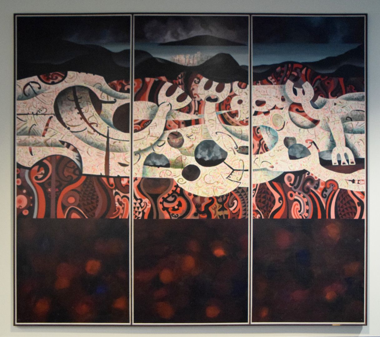 "An important experience for Nin was the period from 1976-1977 when he and his students helped restore the historic Rongopai marae near Gisborne, renowned for its characteristic mixture of postcolonial motifs and painted designs. Nin responded with his Triptych series, totalling 20 panels of metaphysical landscapes, seething with fluorescent renditions of traditional motifs, layered like the carvings on a canoe prow and thrusting through the land.