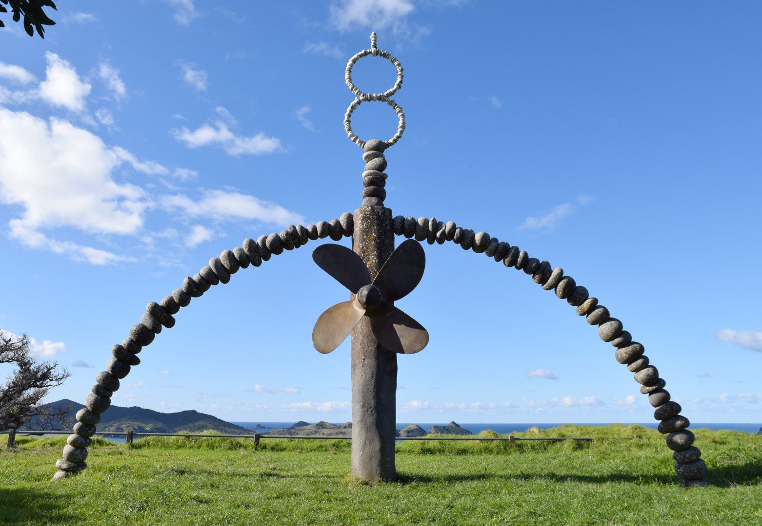 The work is installed on the Matauri hilltop overlooking the ocean site where Greenpeace vessel, The Rainbow Warrior, was sunk as a dive site.