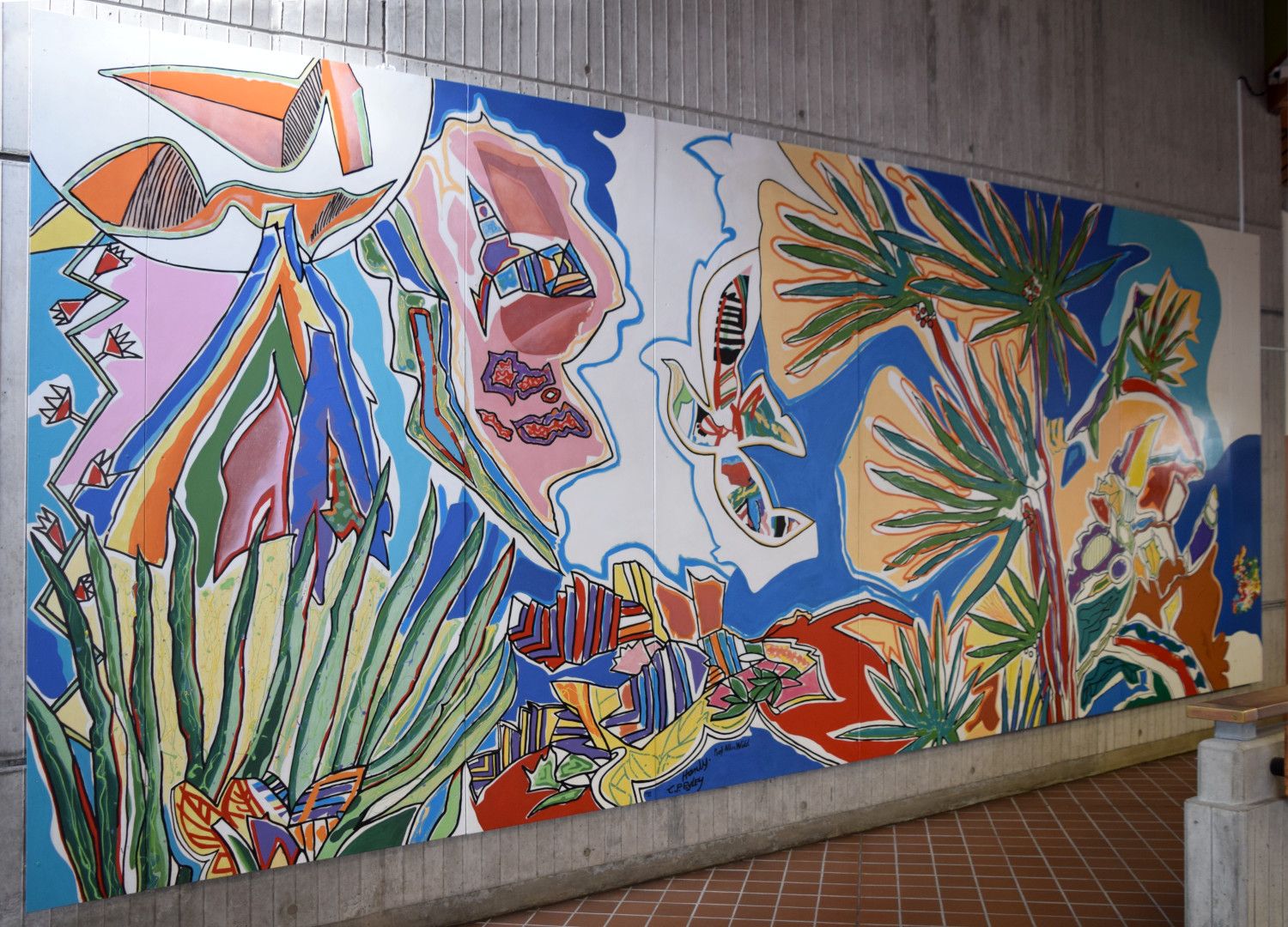 Eight panel, painted mural after Pat Hanly's “Flying Colours” (1982) that was commissioned for the exterior of the same building. After the original mural was painted over, Pond Eyley's mural was hung in the same place, on battens wrapping around the faceted wall facing Symonds Street. The work was moved inside and trimmed sometime in the early 2000s.