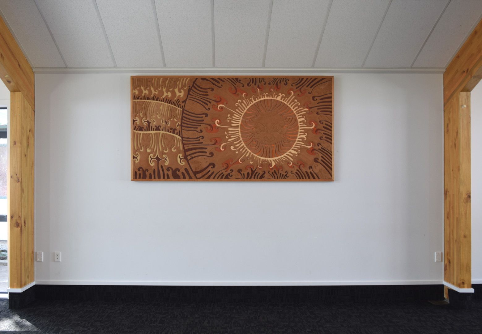 This mural is based on Te Rauparaha's haka, Ka Mate. The figures on the left of the mural depict the rows of haka perfromers. Tama-nui-te-rā, the life giving force, is depicted with personified light rays radiating outwards. The carving style is based on Te Whānau-ā-Apanui figures from Te Tairuku Pōtaka (1770-80) pātaka - sinuous bodies with upraised arms. The koru has been used as a basic design element to highlight movement in the figures.