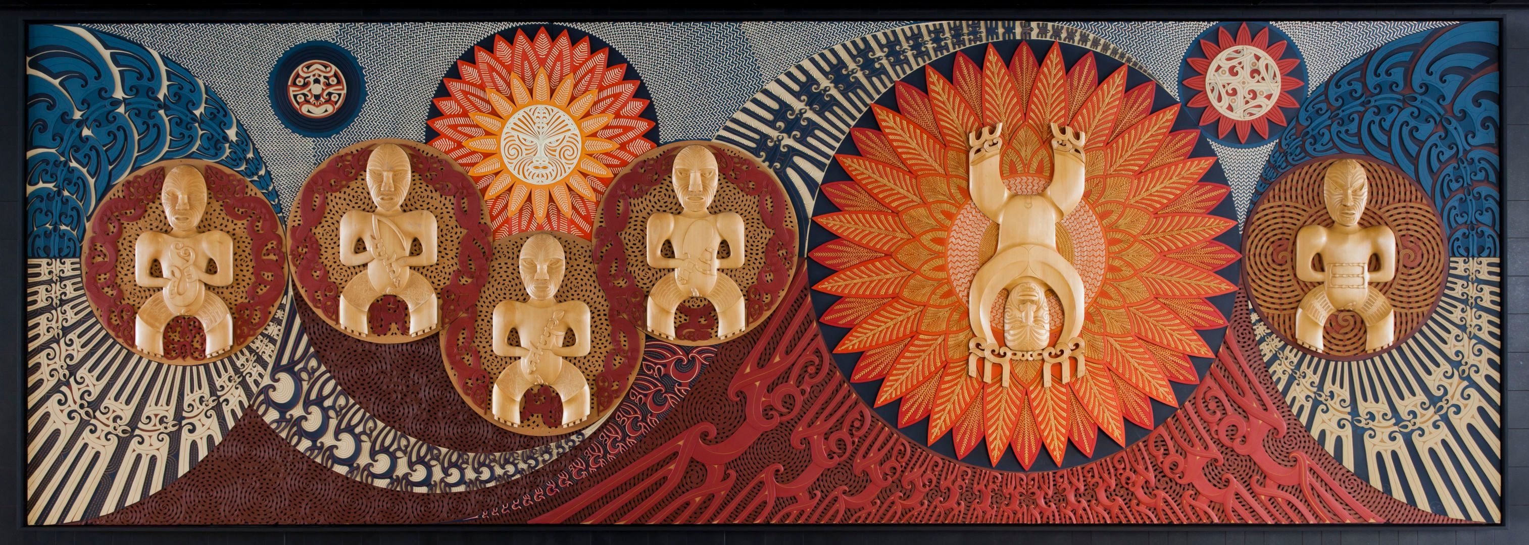 It presents the wehenga (forcing apart) of Rangi (sky father) and Papatūānuku (earth mother) by their son Tāne Mahuta (god of the forests) thereby allowing light to enter the world. Tāne is shown upside down as it was only by using his legs that he was strong enough. Tāne, along with his five brothers, Tangaroa (god of the sea), Haumia (god of uncultivated foods), Rongo (god of cultivated foods), Tūmatauenga (god of war), and Tāwhirimātea (god of the winds and weather), for the pantheon of Māori atua (gods).