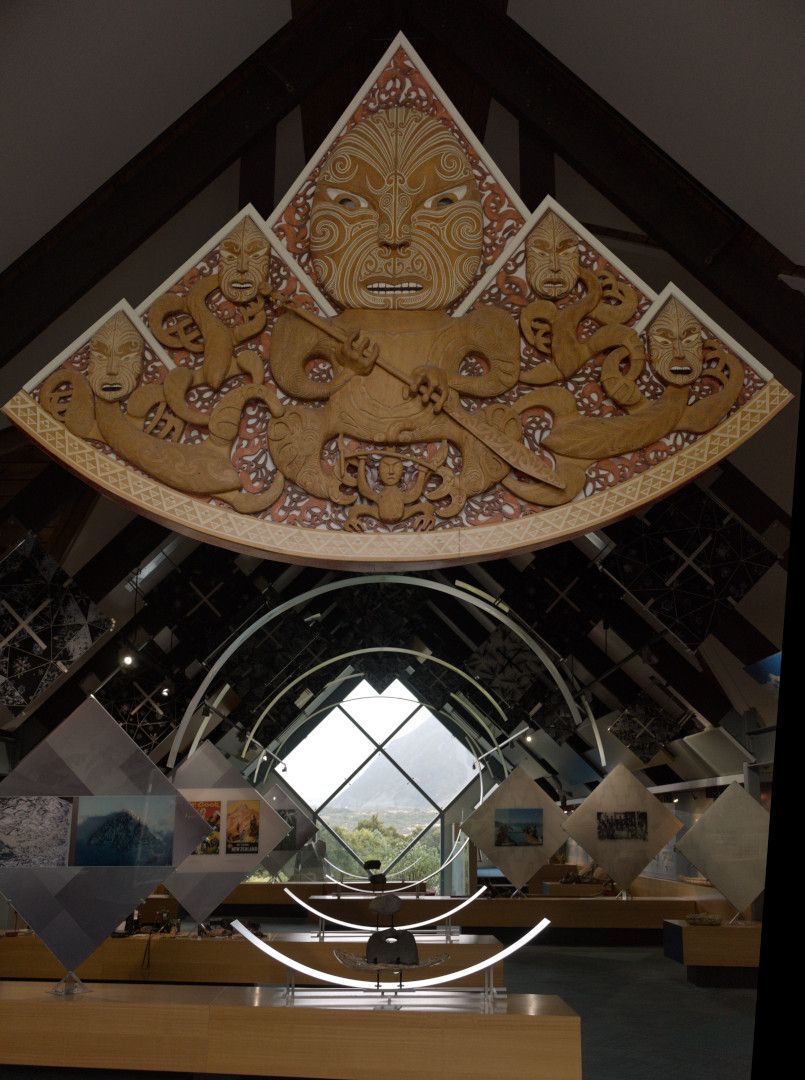 “The carving which hangs above as you enter the Aoraki/Mount Cook Visitor Centre represents Aoraki and his brothers, including Tawhirimatea – the wind.” From left to right these are named as: Rārakiroa, Rakirua, Aoraki, Tawhirimatea, Rakiroa and (below Aoraki) Tū Te Rakiwhānoa.