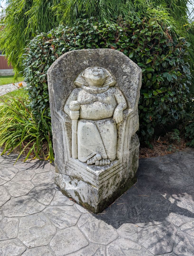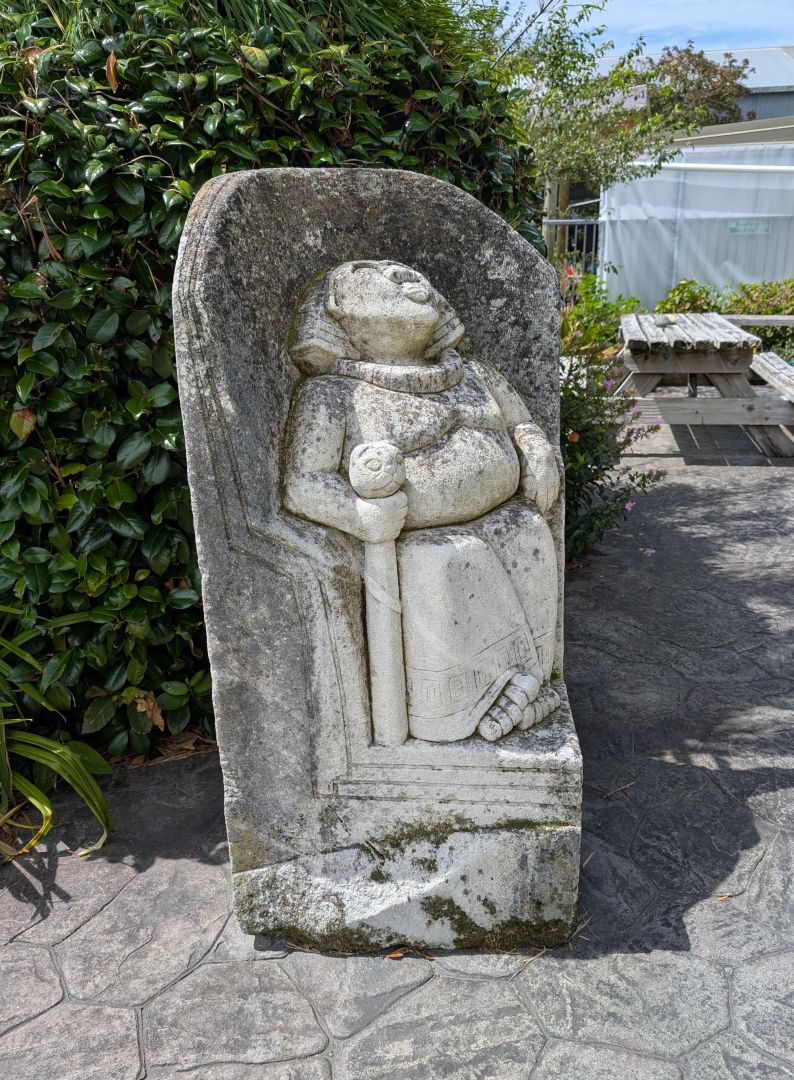 ‘King Tut’ was bought from the symposium by long-time Tākaka librarian Berna Soper, and installed at the Tākaka Memorial Library on Commercial St.
