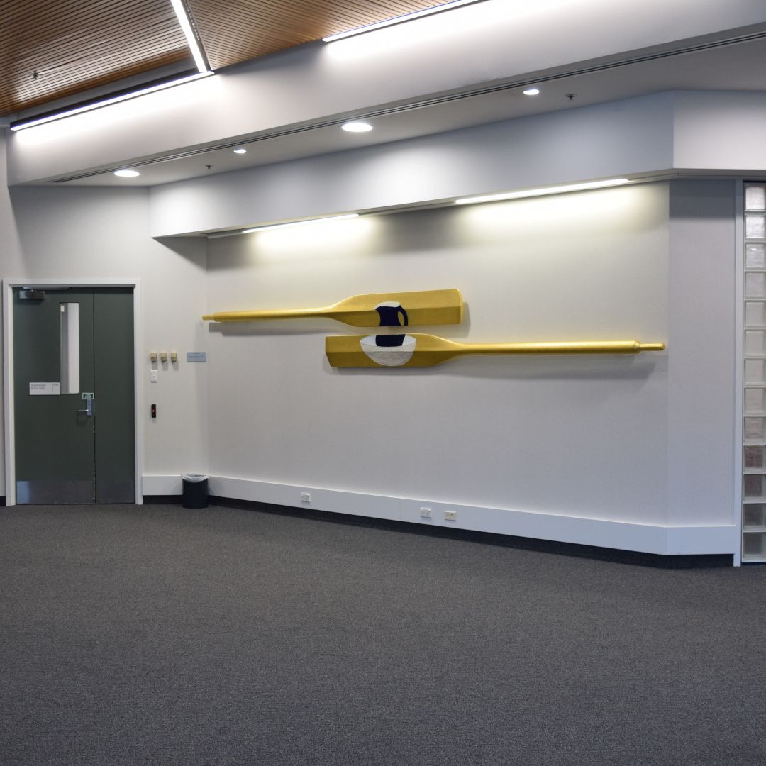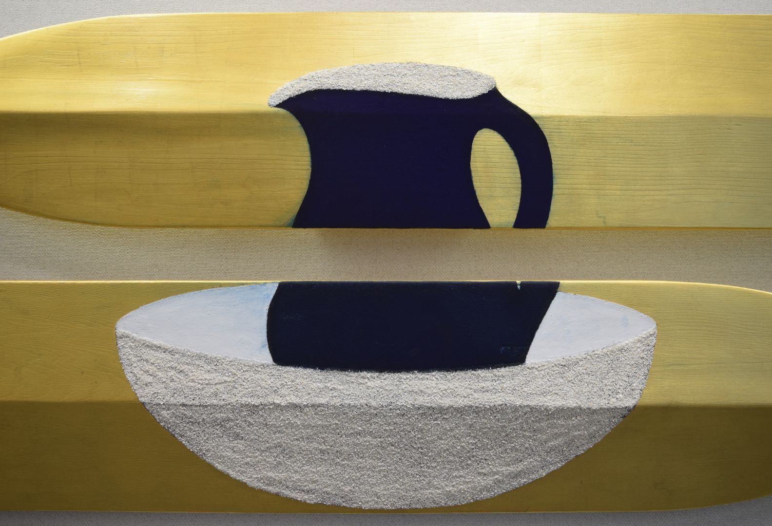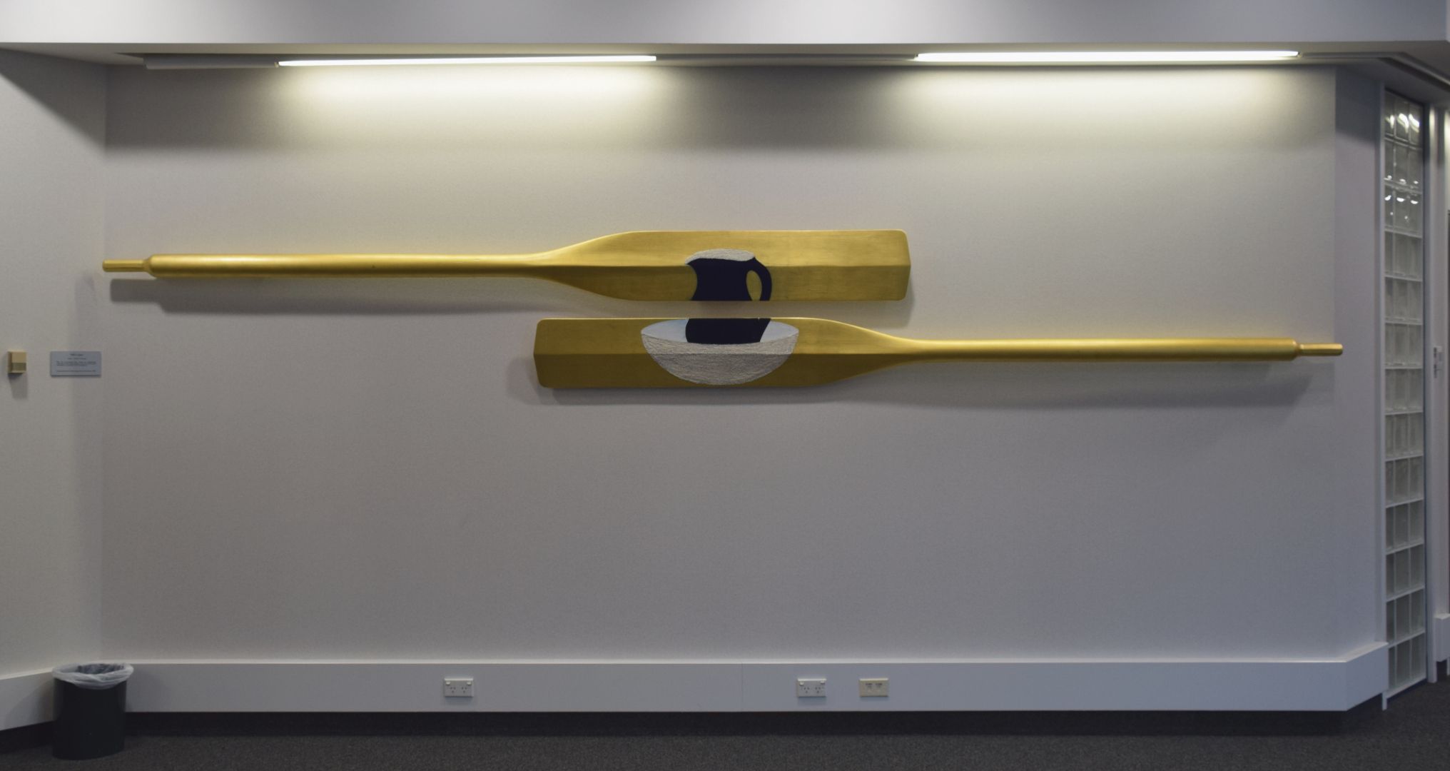 “The wall sculpture is made of Oregon timber and finished in gold leaf oil paint. It comprises two oars lying horizontally to create an embracing, calming quality suggestive of a horizon line. The motif on the blades is defined with pigmented powders and crushed eggshells.