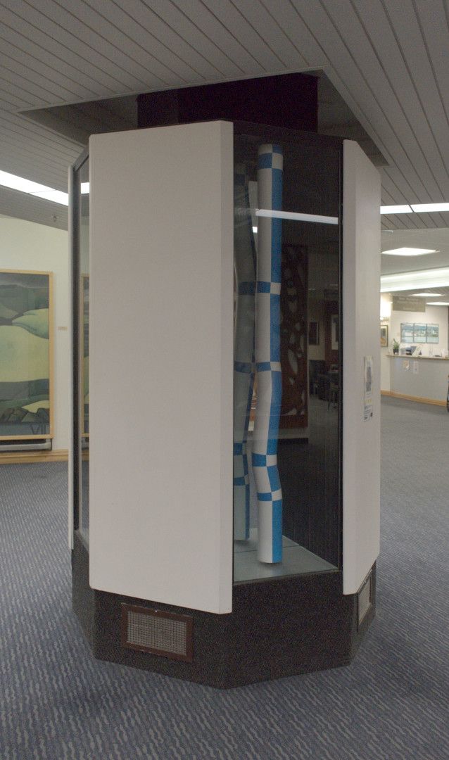 Four rotating vertical forms each contained within their own vitrine space. False depth is created by mirrors (the "infinity effect") on the vitrine interior. The rotating forms are only partially visible due to the shape of the pillar around which the sculpture is built.
