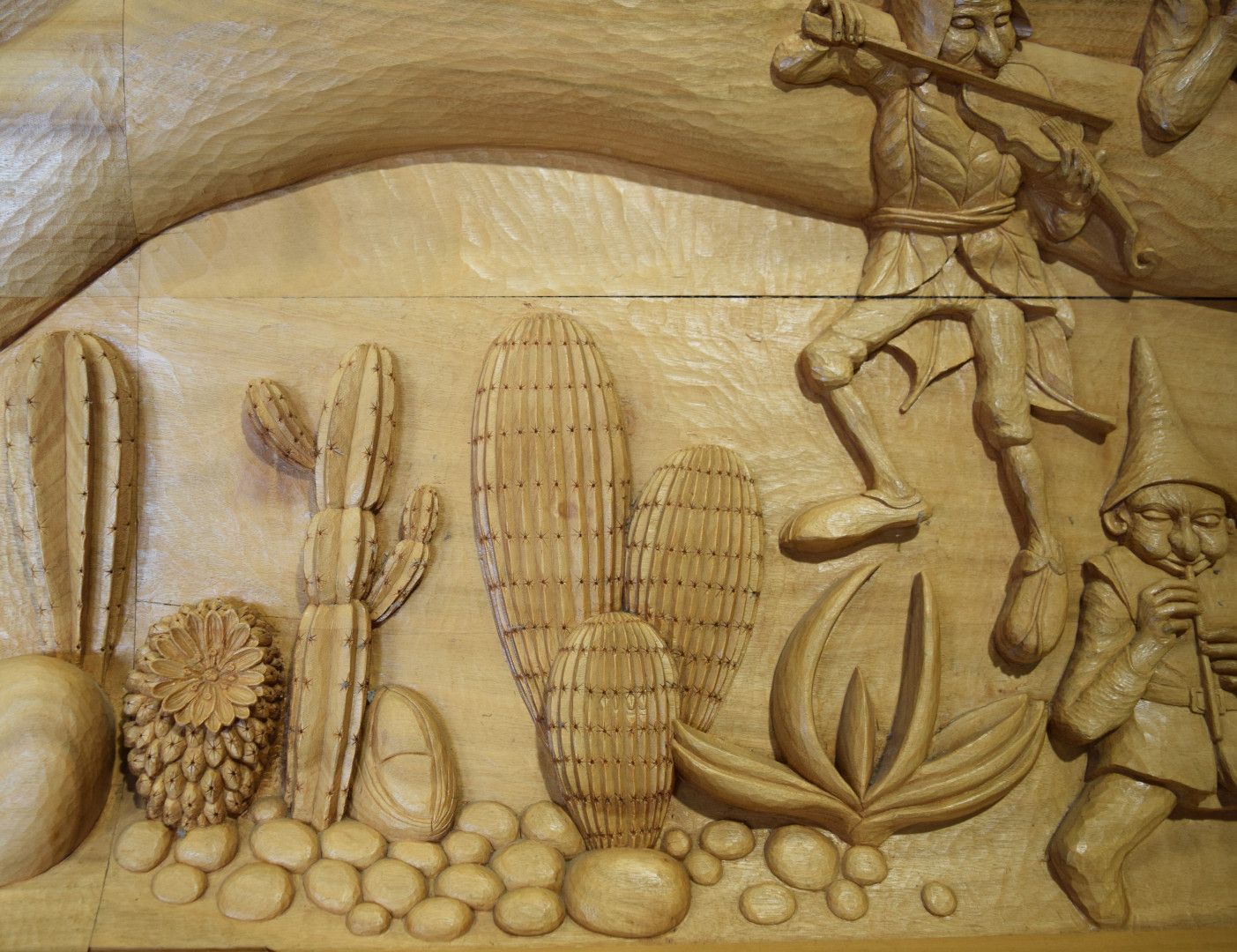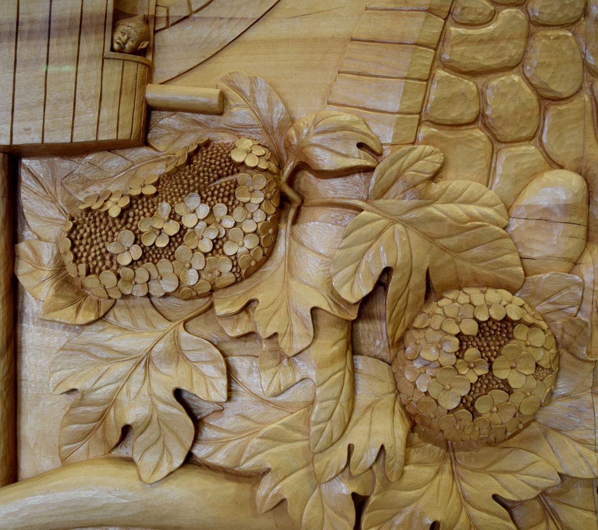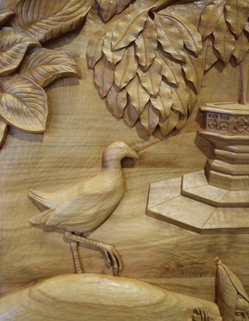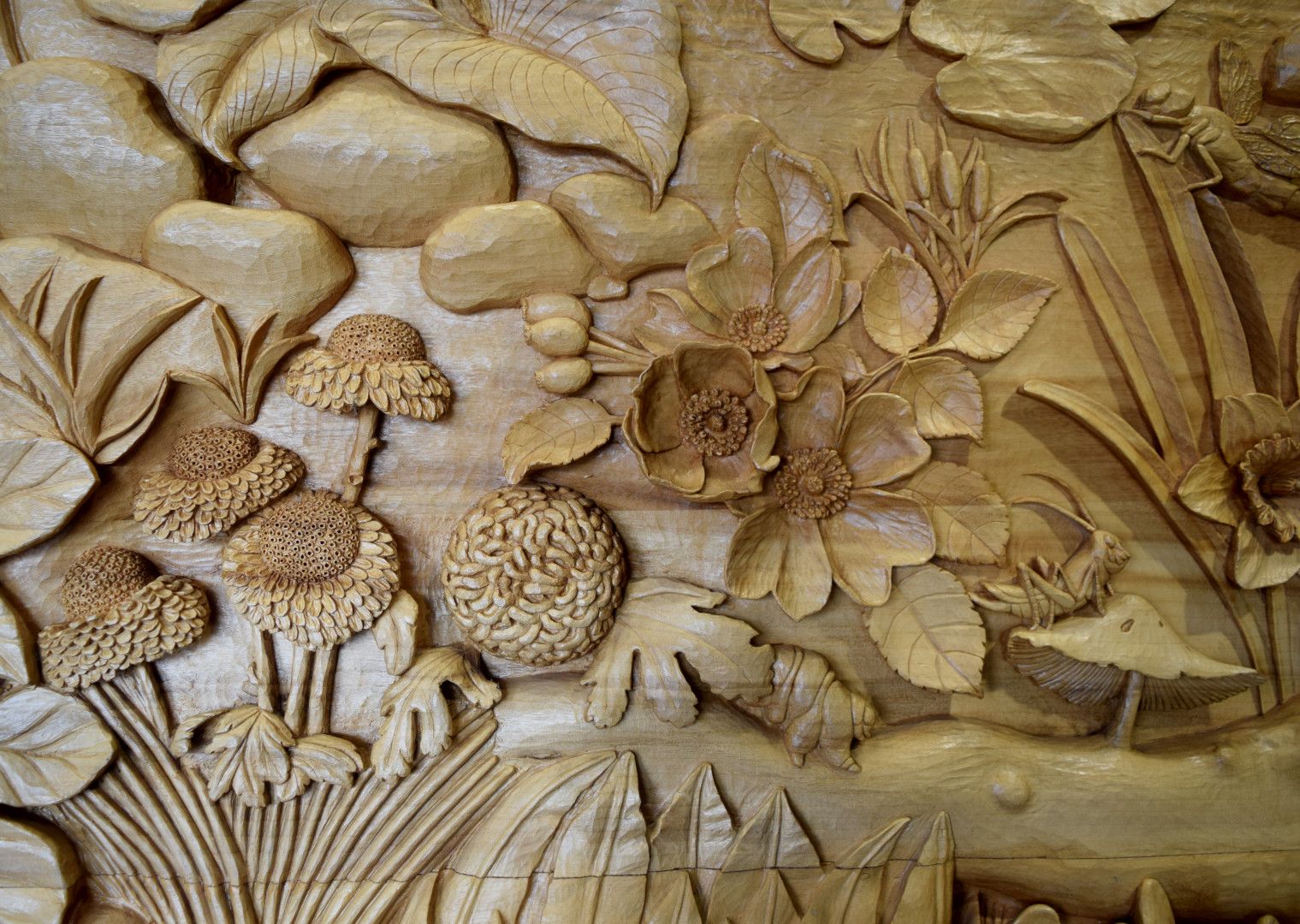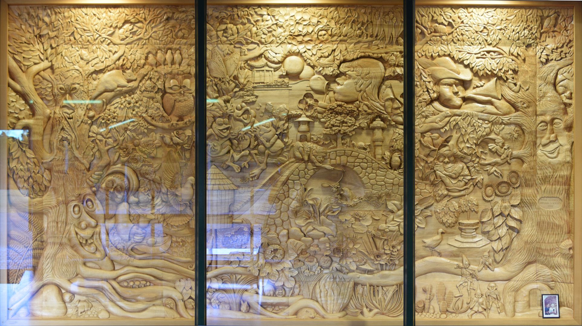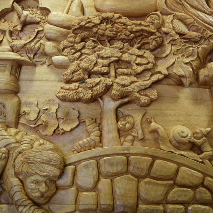 The mural depicts both real life and imagined elements of Hamilton Gardens and took over 7000 hours to carve: an unpaid 'labour of love' for the carvers. Each carver worked independently in their own studios, but met often to compare notes and to ensure consistency between panels. Emphasis was given to capturing the interest of children through fantasy and creatures, animals and plant-life. The result features intricately carved flora and fauna and mythical creatures of the forest. It is now behind glass in its original location, and well signposted on the exterior of the building.