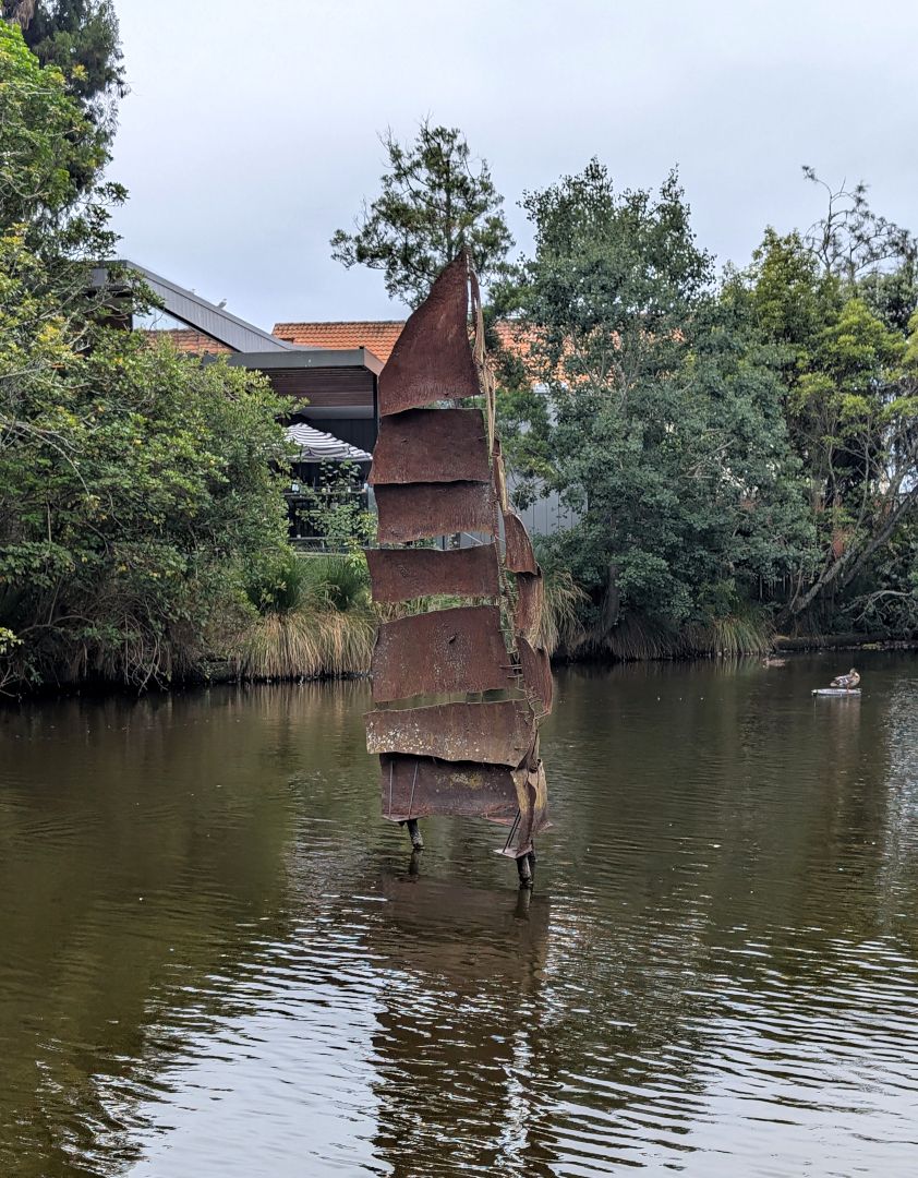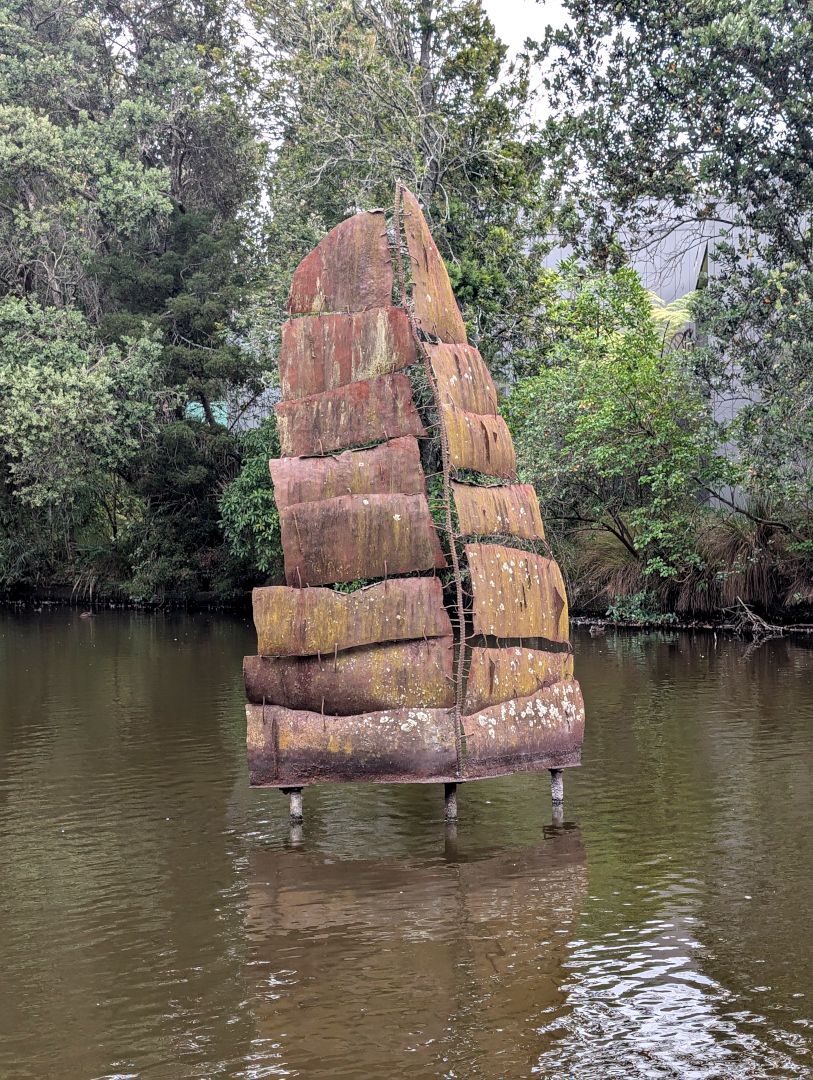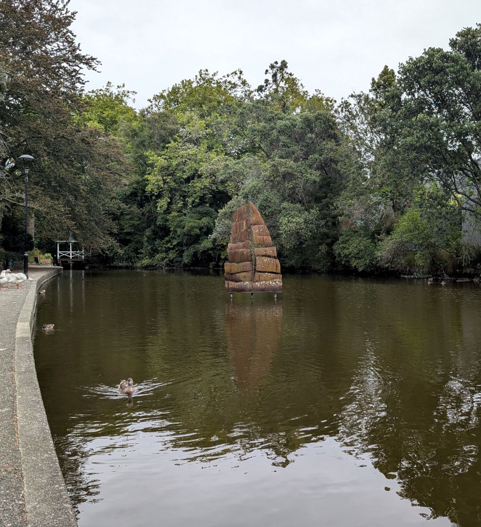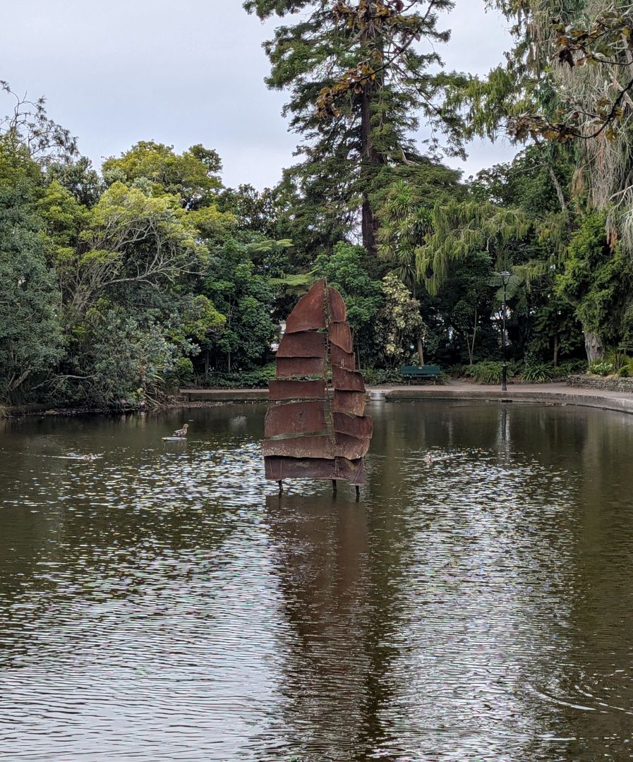 Installed ‘sailing’ in the Queens Garden pond, ‘Sentinel’ is a steel sculpture that was inspired by the base of the Nikau palm frond. It refers to the waka and ships that brought waves of people to Aotearoa New Zealand. Created in 1998 by Dominique de Borrekens and Grant Scott, this sculpture honours the Nelson settlers who planted the Queens gardens over 100 years ago.