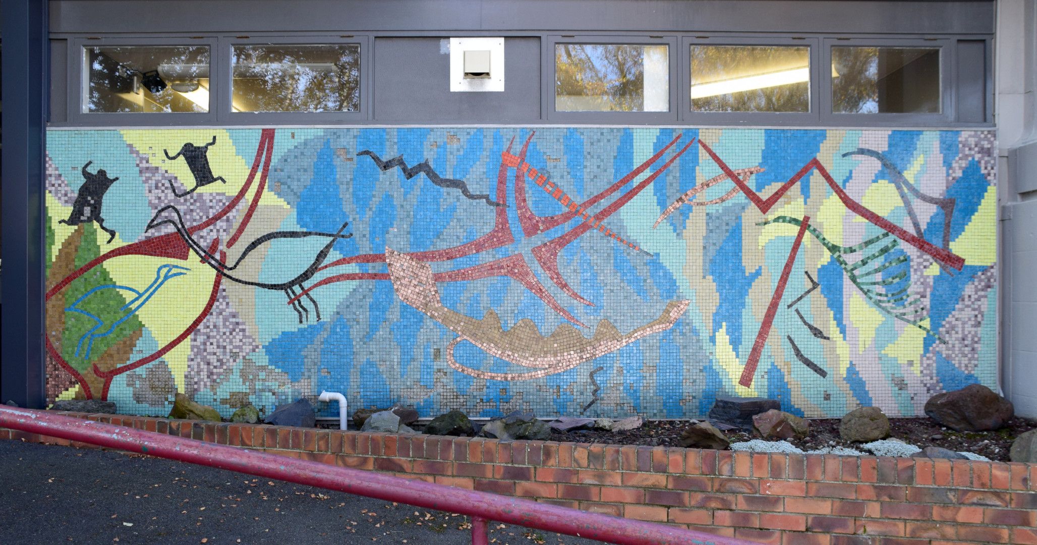 Don Wilson designed the mural, based on rock drawings, to be rendered in Italian glass tiles. Wilson worked with Bas Benseman who had the technical knowledge turn the design to reality. The mosaic took 10 months of painstaking work to complete and was finished in 1968."