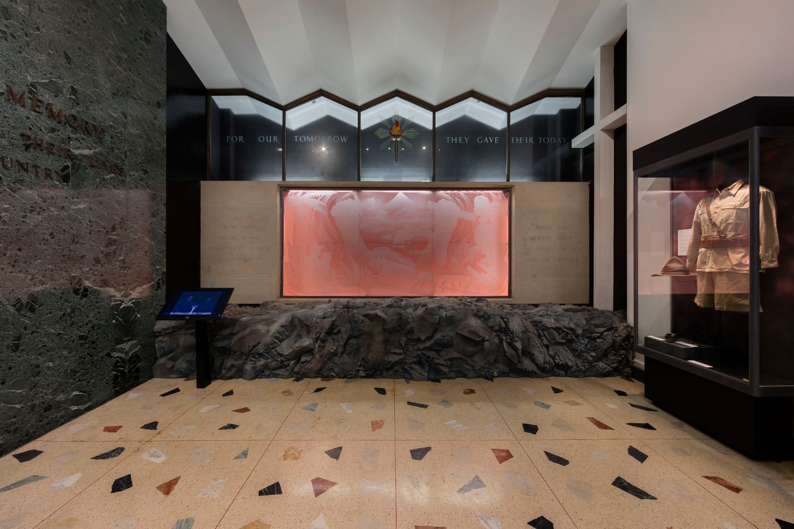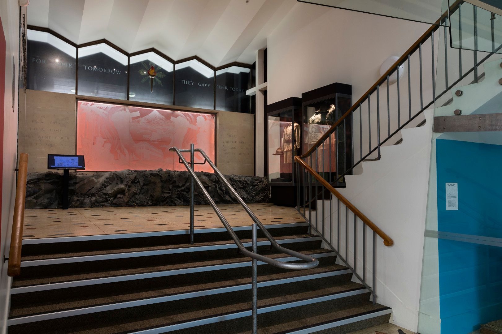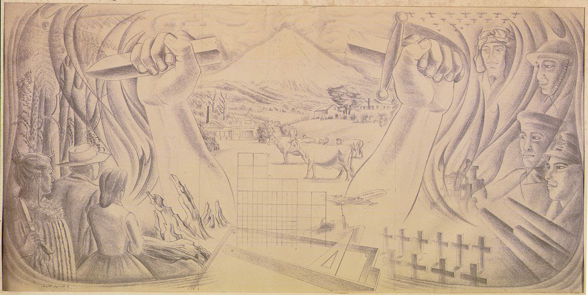 Edgar Collins, the architect in charge, wanted a feature wall to be the focus of the actual war memorial. He planned for this to be located where it would be seen by the most people: on the return of the main staircase leading into the hall from the building’s entrance off Ariki Street. Collins allowed space for a mural measuring 3.3 metres wide by 1.8 metres high, surrounded by a dark-green breccia and limestone features, with bronzed lettering above. The location presented a challenge because the scheme for the mural would have to make sense to the eye from two potentially distorting perspectives as people walked up and down the staircase.