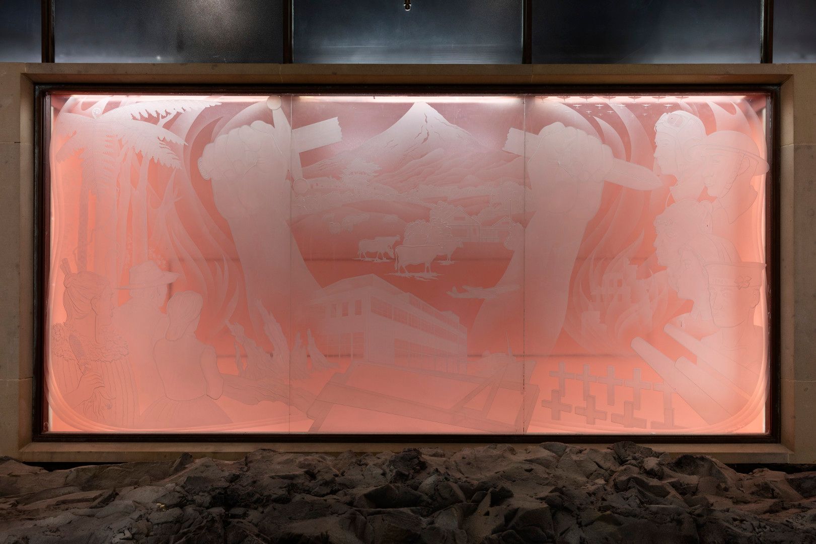 The sub-committee approved the design and it was created using the technique of sand-blasted heavy panels of plate glass. Once installed, the mural was back-lit with a salmon-pink light — an effect created by white fluorescent bulbs shining on a coloured recess behind the glass.