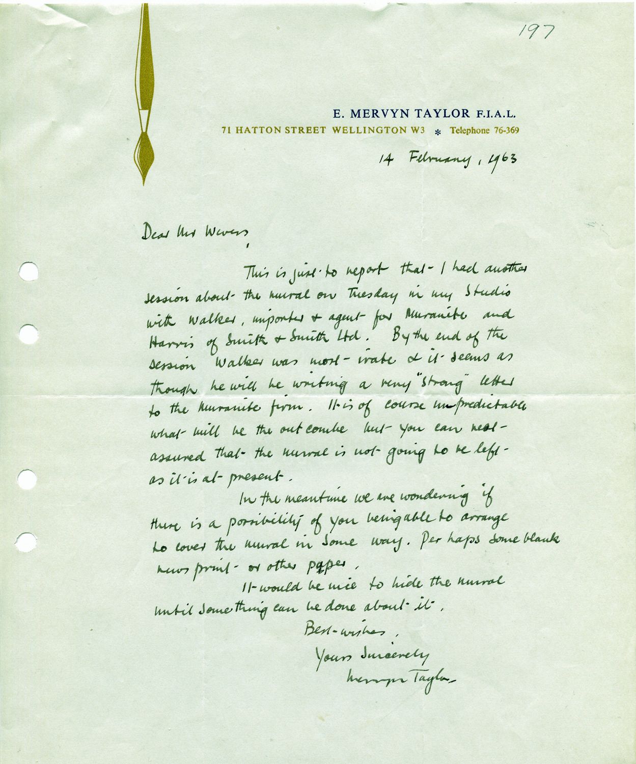 Text adapted from Gareth Winter’s essay “Lest We Forget: The Battle for the Mural” in Wanted: The Search for the Modernist Murals of E. Mervyn Taylor (Massey Press, 2018).