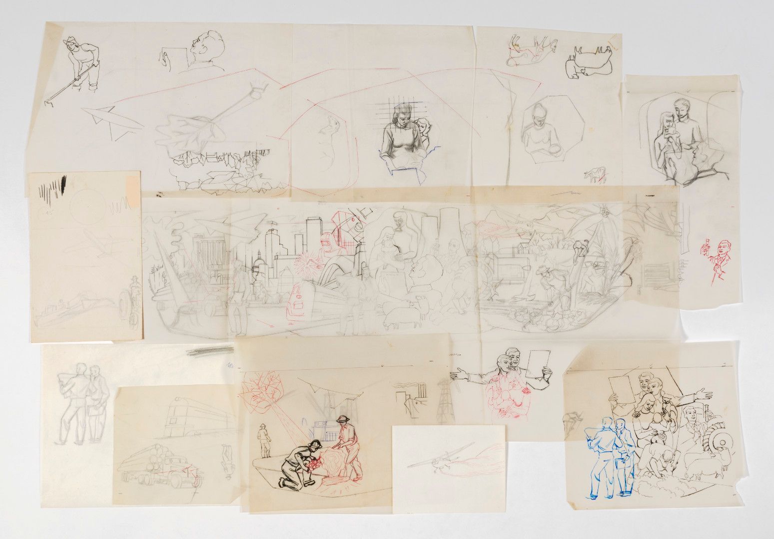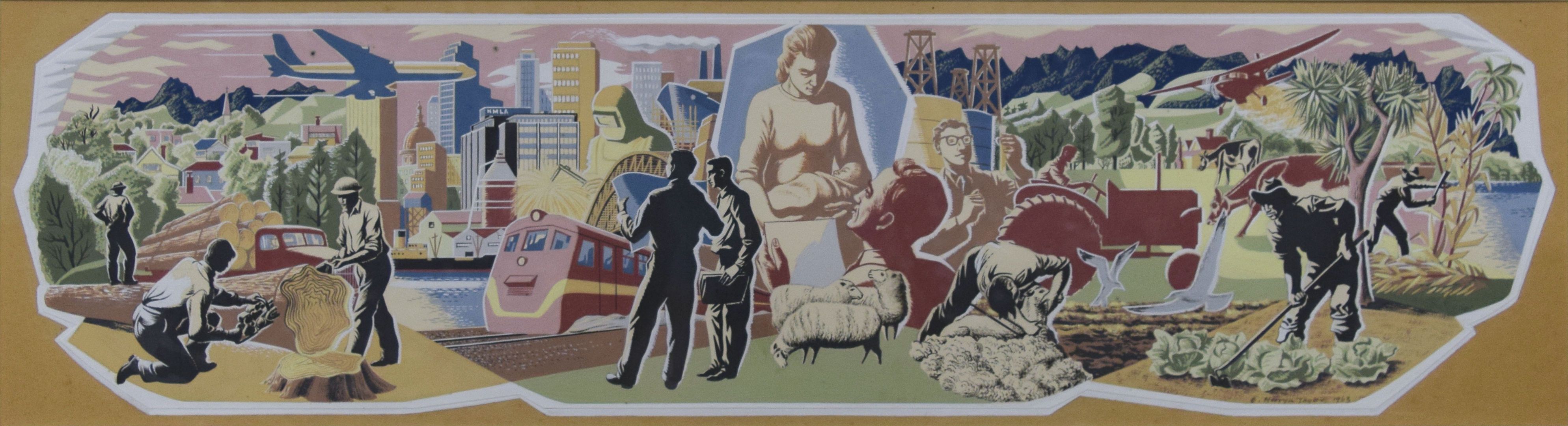 Mervyn Taylor’s mural for the interior of the National Mutual Life Assurance building in Wellington, now presumed destroyed, was commissioned in 1963 by architectural firm Gray Young, Morton, Calder & Fowler. The mural reads as a collage: images of workers, all men, most likely Pākehā but possibly also Polynesian, performing a range of white- and blue-collar tasks in a smorgasbord of crisply illustrated environments — urban, rural, suburban and a very tidy ‘untamed’ wilderness. At the centre a woman looks down at a baby in her arms while a man looks up at her, holding a piece of paper in his hand—an insurance salesman, here either to make good on the woman’s dead husband’s policy, or to reassure her (but really to reassure her husband, whose earnings will pay for the policy) that should anything happen to said husband while he is busily keeping the country ticking over, there will be some compensation. Some life insurance.