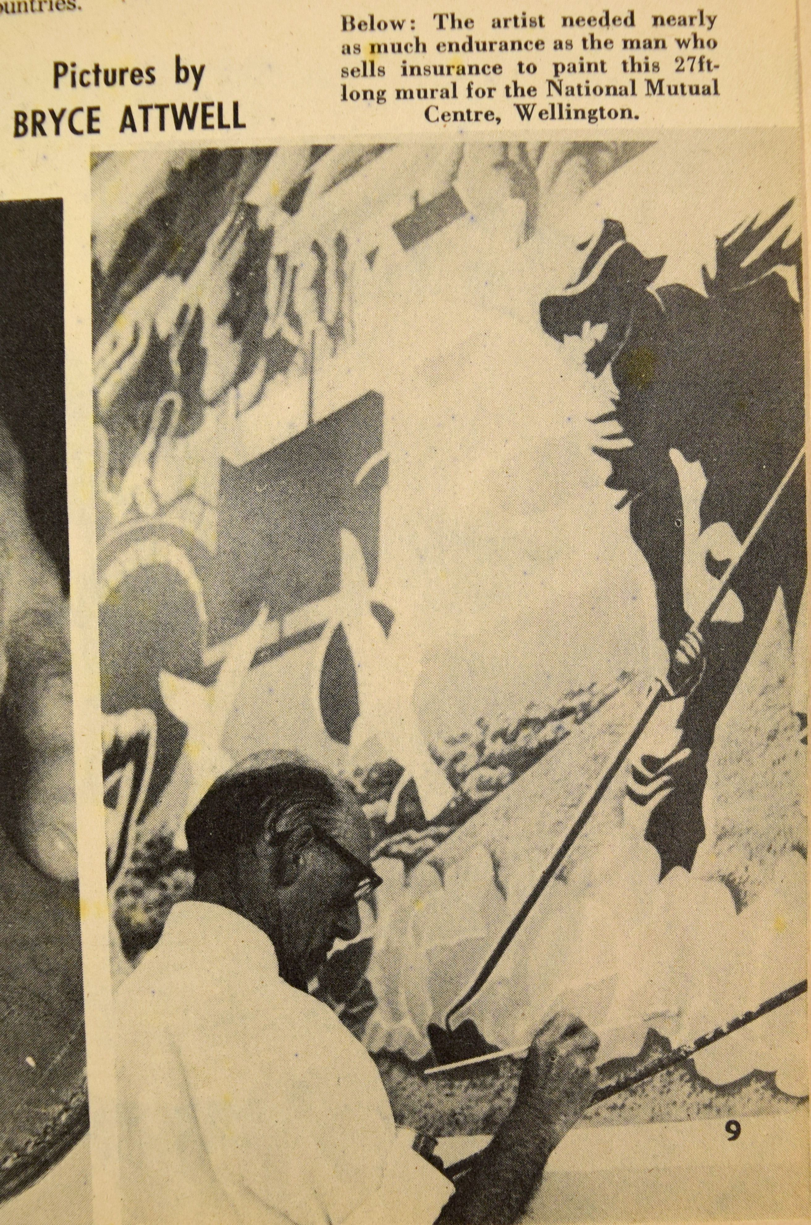 'National Mutual Life Assurance, offices, reception area with mural, Wellington' (1963) by architectural photographer Duncan Winder, showing lost mural by E. Mervyn Taylor. Alexander Turnbull Library, Te Whanganui-a-Tara Wellington (Ref: DW-1259-F)