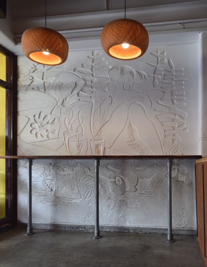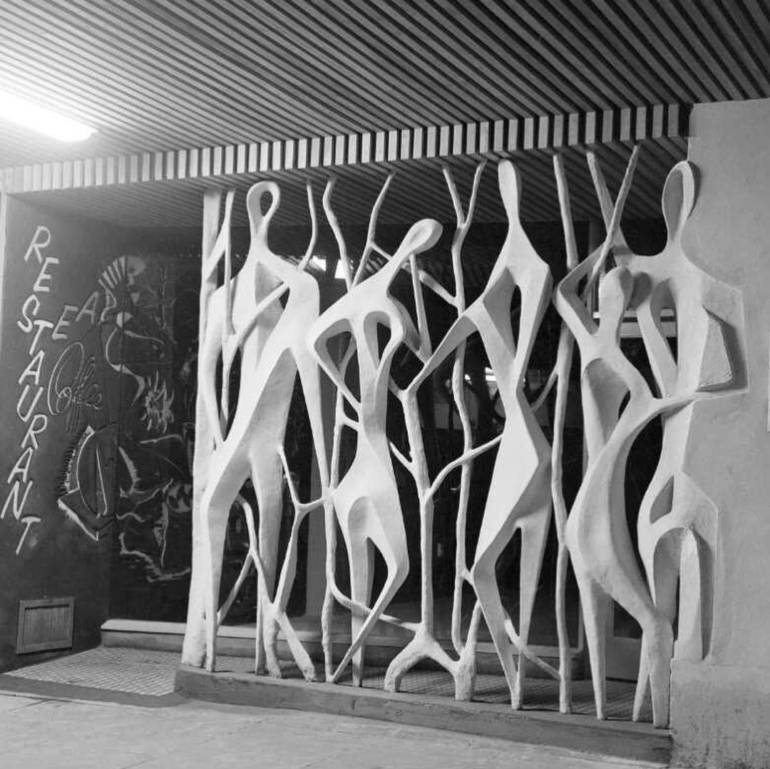This mural was an extant feature of Chez Lilly, one of many mid-century coffee houses that transformed the urban life of Wellington. Both the mural, and interior fit-out, were designed by Austrian architects Erwin Winkler and Fritz Eisenhofer (hence the mural is signed W & E).