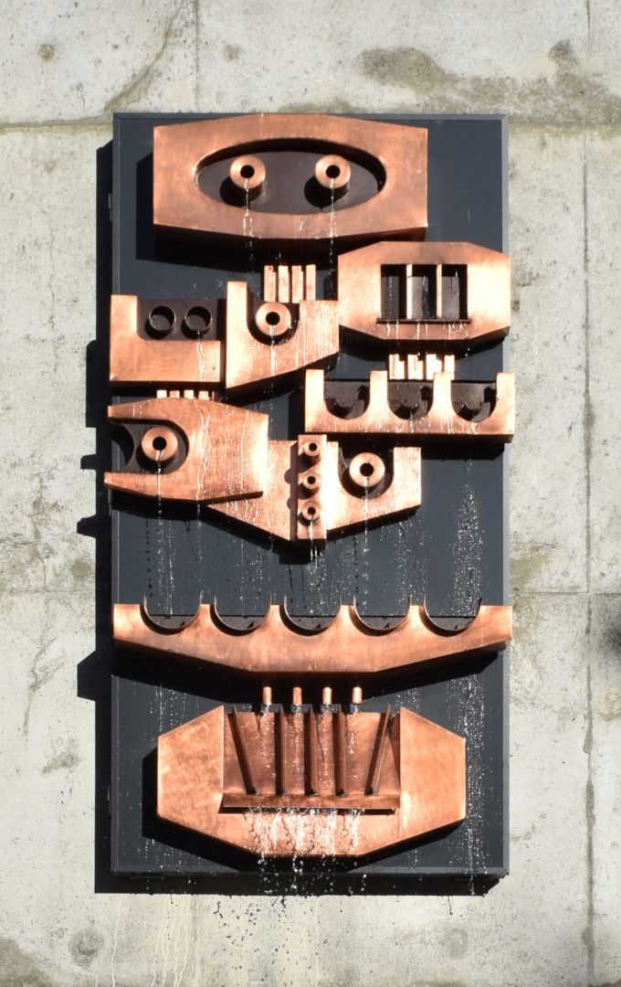 Water coming out of the circular spouts symbolises small streams, which flow together into a river, embodied by the copper trough with five semi-circular spouts. And as Fred Graham states, “of the many features on the river, perhaps the most impressive is the waterfall”, represented by water spilling over the bottom edge of the sculpture.