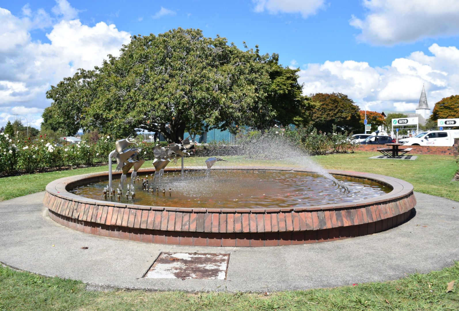 "Presented to the Borough and District by the Te Awamutu Beautifying Society. October 1971. Chairwoman Rona W. Hammond, Sculptor Frederick J. Graham; Architect, Bruce M. Curlett; Contractors Jack Russell Ltd."