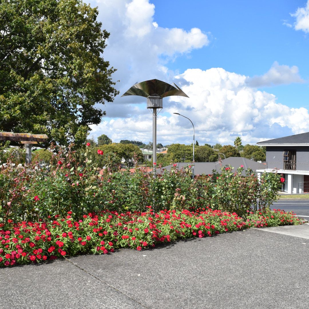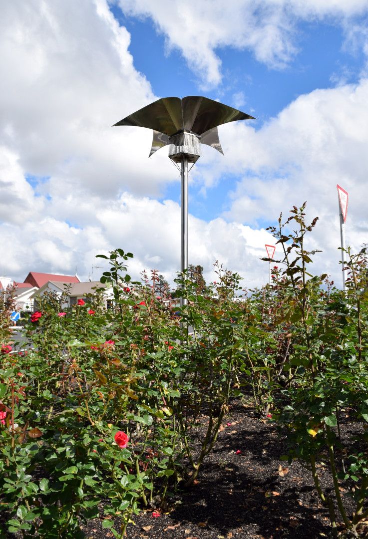 At just 3 meters tall this stainless steel lamp post rises above a flower bed of Te Awamutu's iconic roses. During the day the scooped stainless panels of this sculpture reflect the roses.