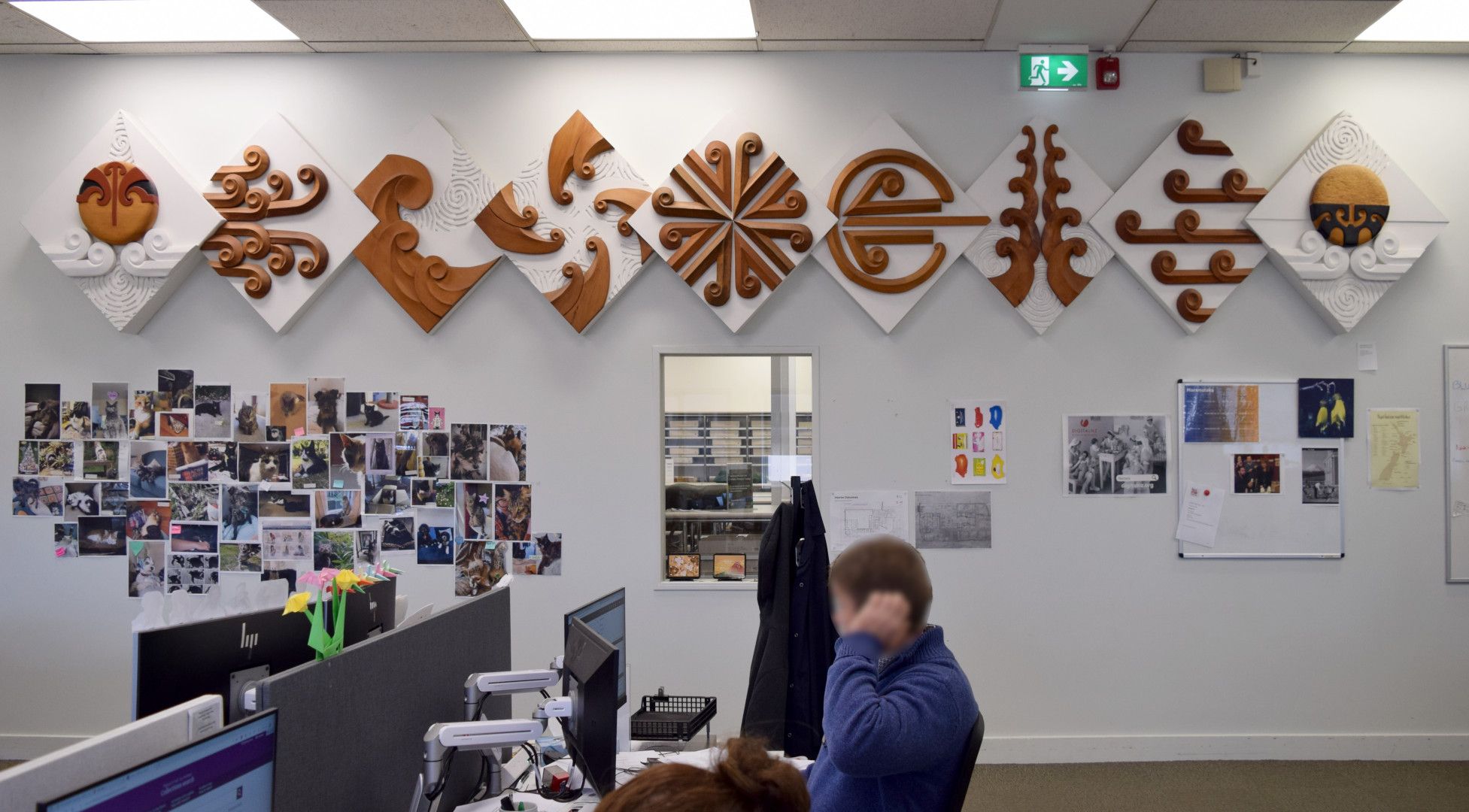 Nine interlocking diamond shapes with carved relief representing a part of the globe. Each panel is painted white and has variations of the koru motif in native woods, such as kahikatea, rimu, kauri and tōtara.