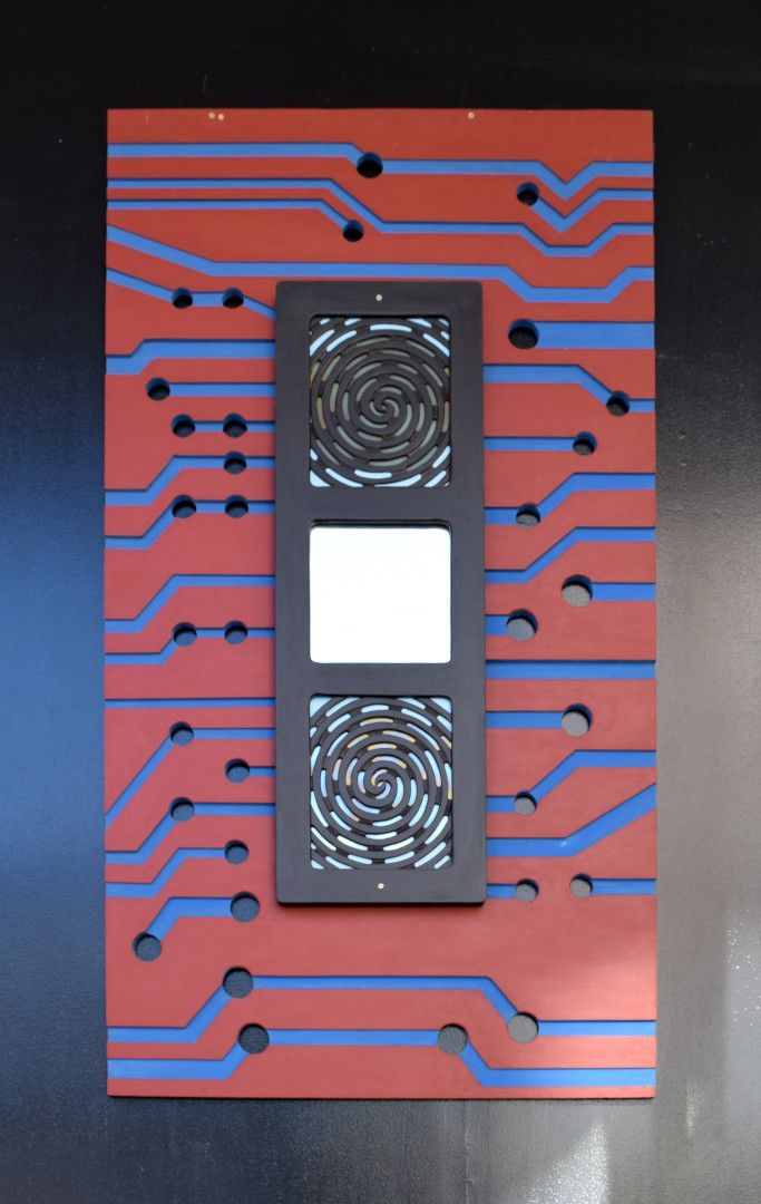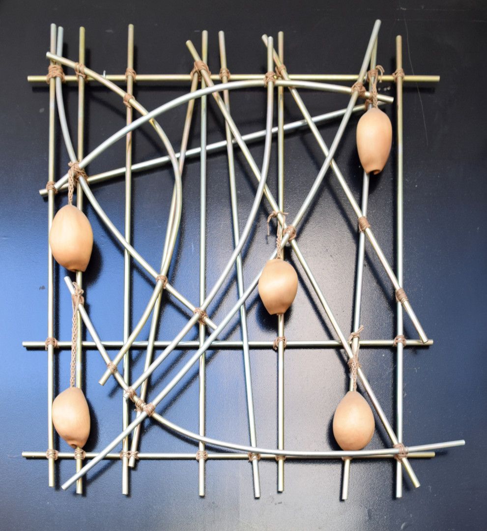 This work represents several forms and symbols of knowledge, light, writing, a Pacific Island navigation chart and a computer circuit. An information panel installed with the work reads: