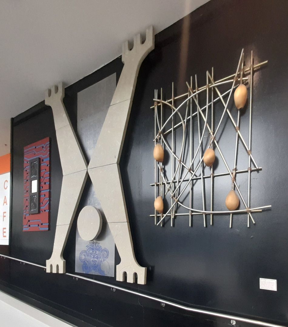 “The work symbolises Tane separating Earth and Sky, thus bringing the light of knowledge into the darkness of ignorance. The figure on the right represents knowledge kept in the form of a Pacific Island navigation chart. The steel sheet behind Tane represents the preservation of knowledge through writing - in this case the Treaty of Waitangi. The figure on the left symbolises the preservation and communication of knowledge by electronic medium.”