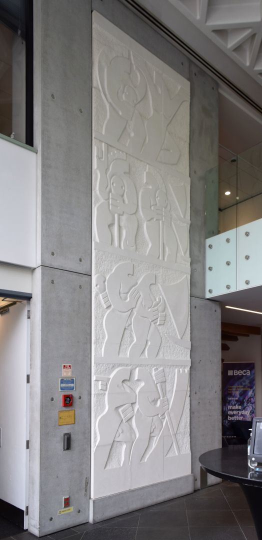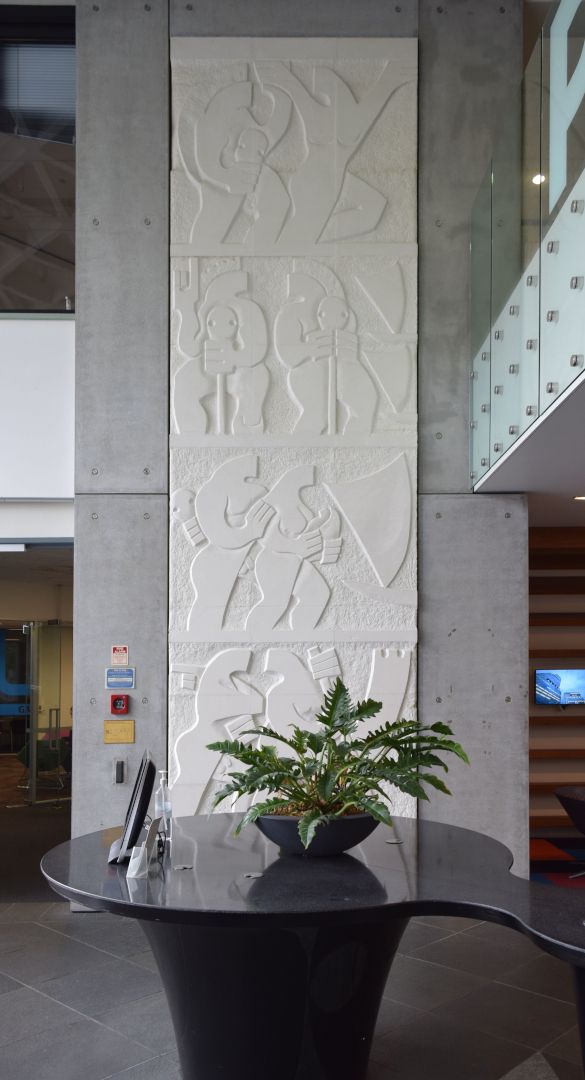 At the time of their unveiling, the works were considered by NZ Herald art writer Richard Dale to be “very successful examples” of what he considered to be “well sited artworks”, further commenting that, together “the five works at the ARC sustain a complex series of interactions, a connection to the land, to heritage, be it Maori or, in O’Connor’s case, Irish, and thus to an overcoming of displacement and a reclamation of history, culture and spirit” (NZ Herald, 14 June 1990, p.2). Four of the wall sculptures face each other in pairs, framing the foyer space, while the Hotere (now missing) was installed at the far wall facing the entrance.