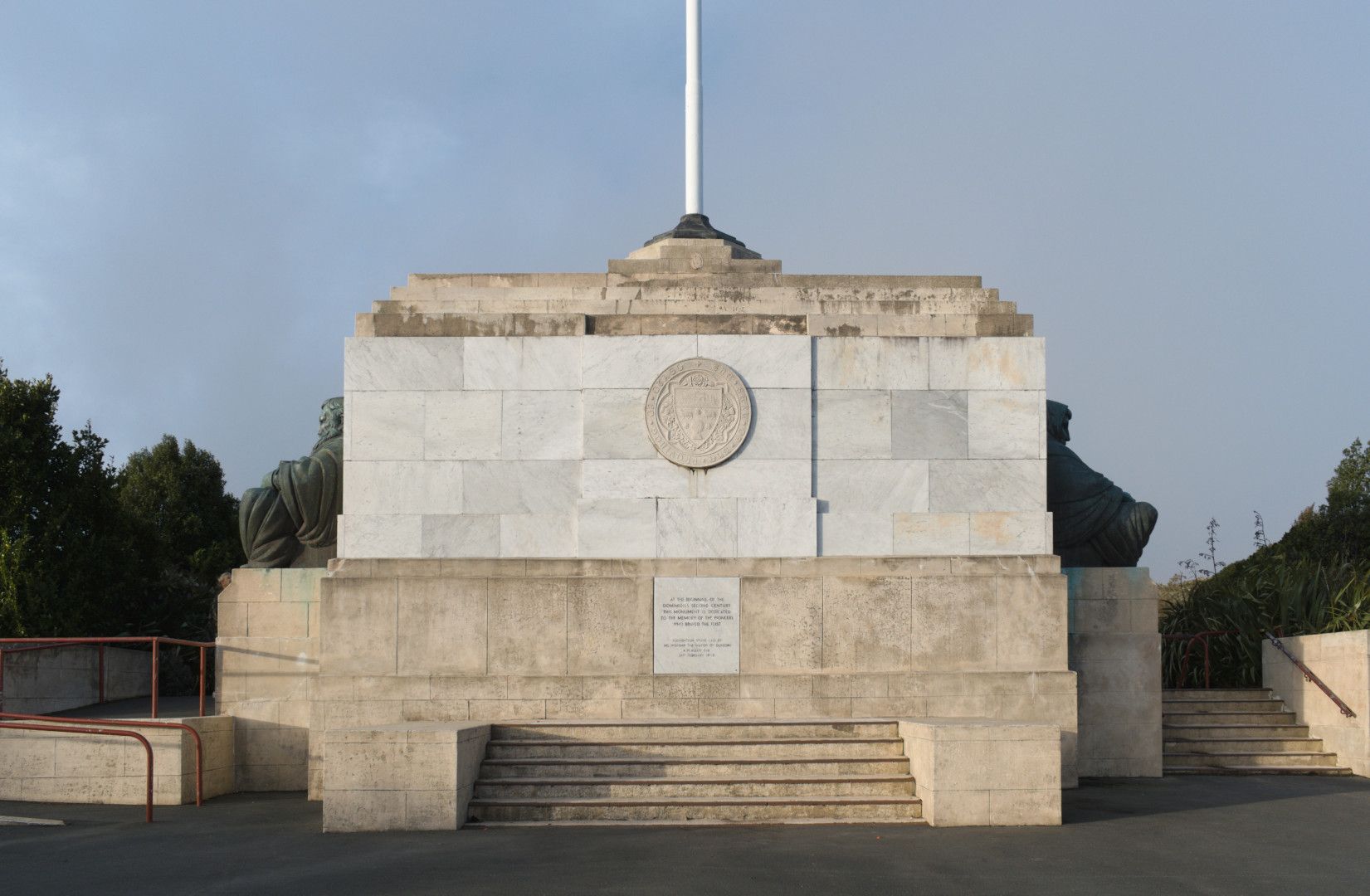 A monument with walls, steps, and a surrounding asphalt surface. A foundation stone reads: "At the beginning of the Dominion's Second Century this monument is dedicated to the memory of the pioneers who braved the first. Foundation stone laid by His Worship The Mayor of Dunedin A.H.Allen Esq. 21st February 1940".