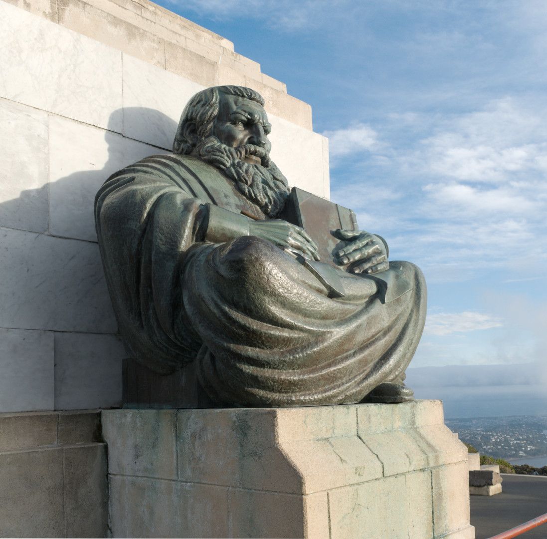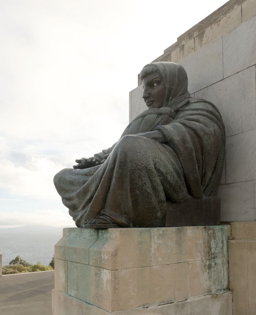 Two bronze allegorical figures flank this memorial: the ancient bearded figure, facing north-west, represents 'Old Man History,' while the female figure, facing south-east toward the sea, represents 'The Thread of Life.' The monument is faced with limestone and marble. Carved reliefs, in marble, are also installed on the monument: one of thistle and one of fern.