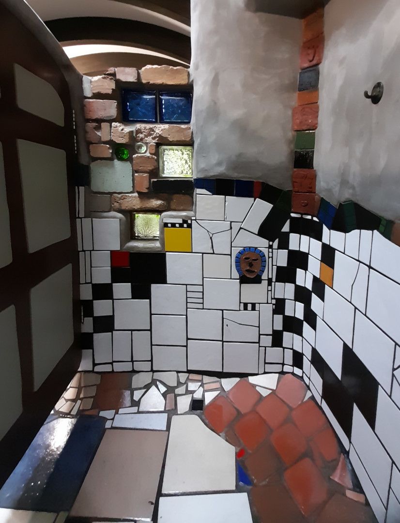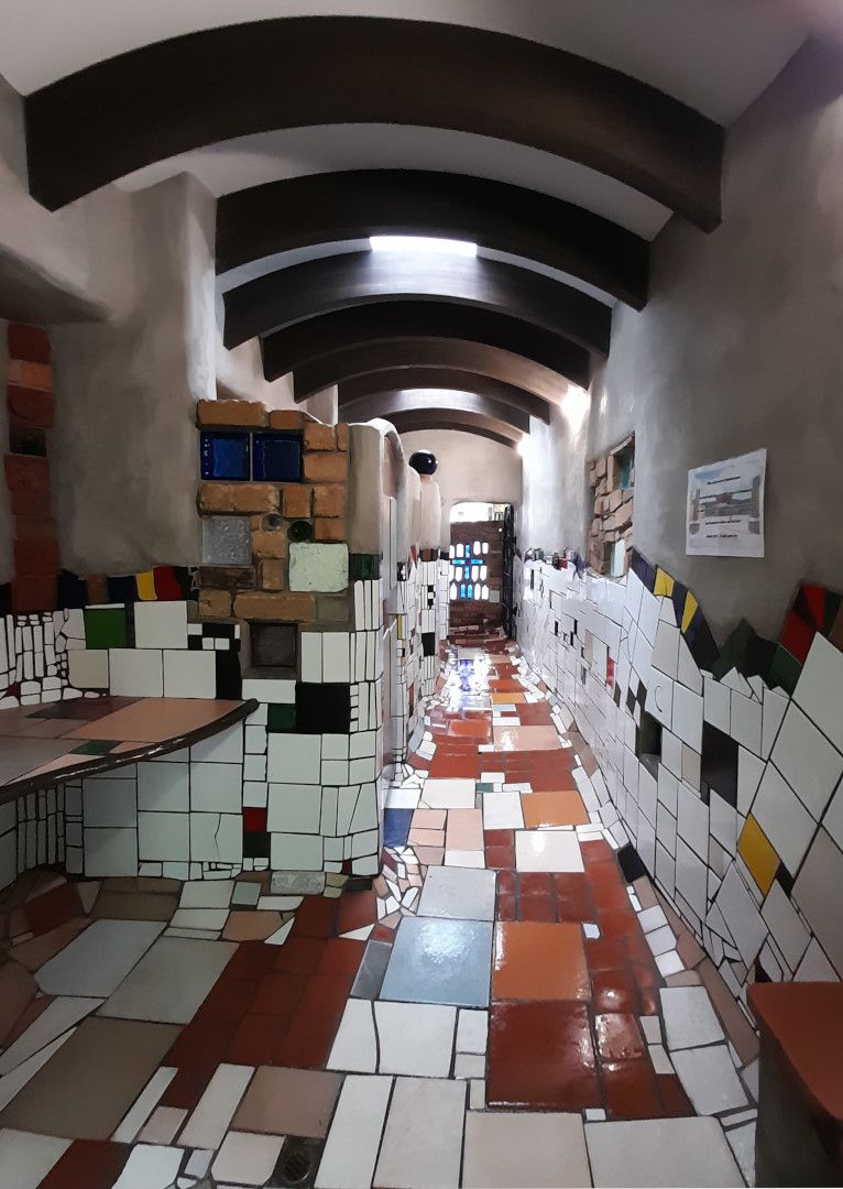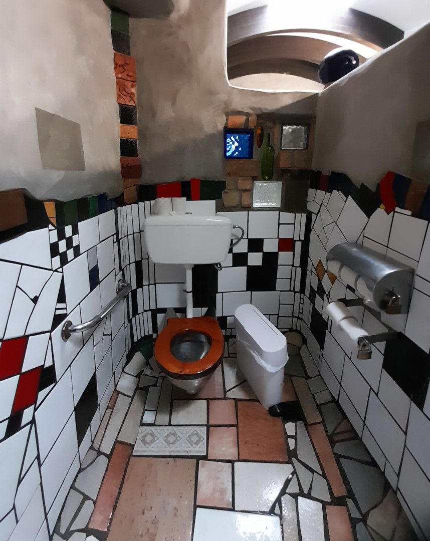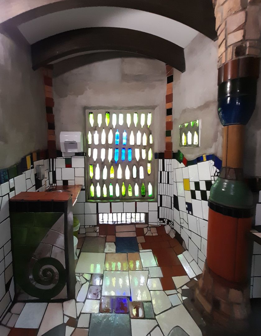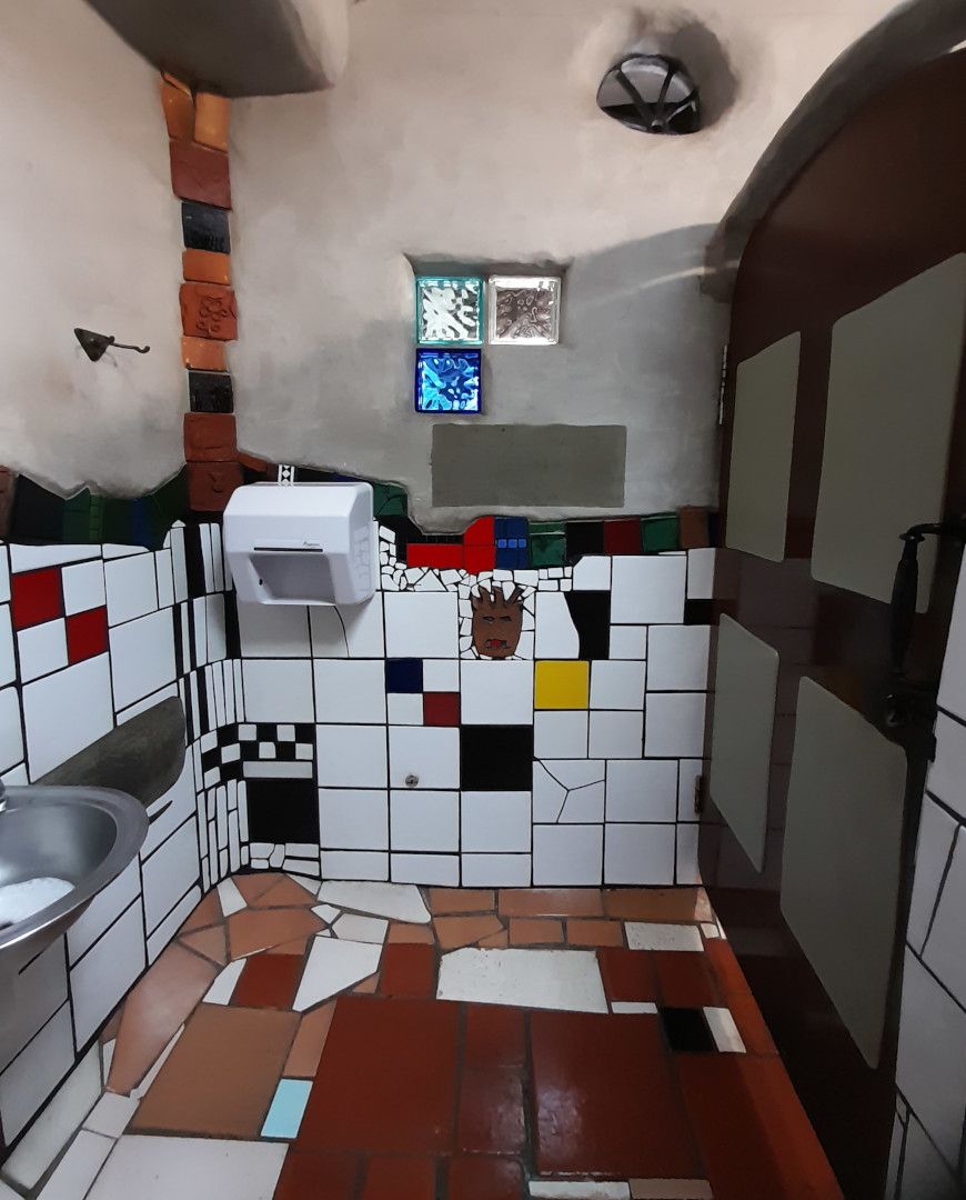 Designed and conceived by the reclusive Austrian/NZ artist who lived nearby from 1975-2000. His last project before his death and the only one resolved within his lifetime in the Southern Hemisphere. The toilets are constructed of wavy lines, irregular ceramic tiles, integrated smalls culptures, coloured glass and a live tree incorporated in the architecture. Recycled materials are used thorughout, and vegetation removed for construction is replanted on the roof.