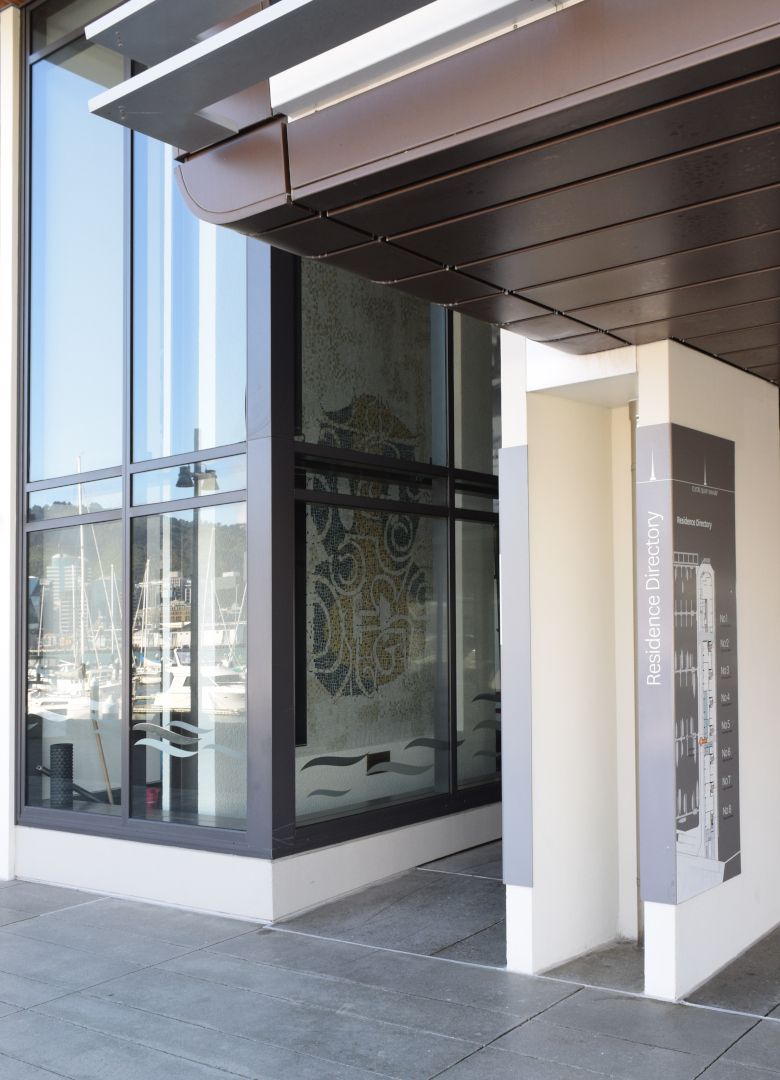 - Exterior covered entryway, Clyde Quay Wharf Apartments, Clyde Quay Wharf, Oriental Bay, Wellington (sites are: 1 x Located outside the gym between No.5 & No.6 Clyde Quay Wharf entries; 3 x located in laneway between No.1 & No.2 Clyde Quay Wharf)