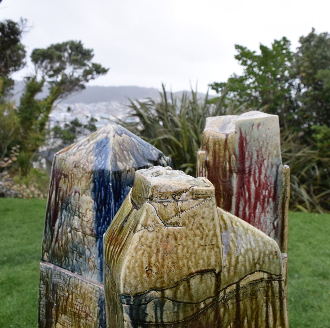 Three closely grouped megalith or obelisk forms. The columns have been made in massive sections assembled vertically, with dripping glazes in greens, browns, reds and blues.