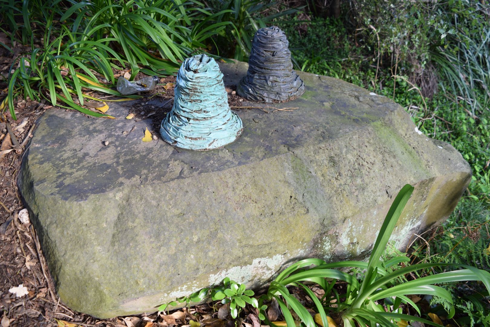 The piece consists of two thimbles, both of bronze, resting on a roughly hewn piece of Trethewey granite.