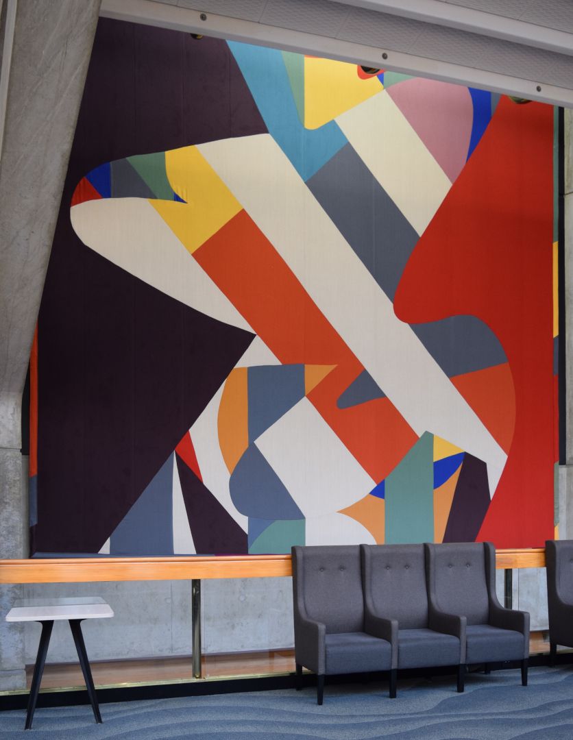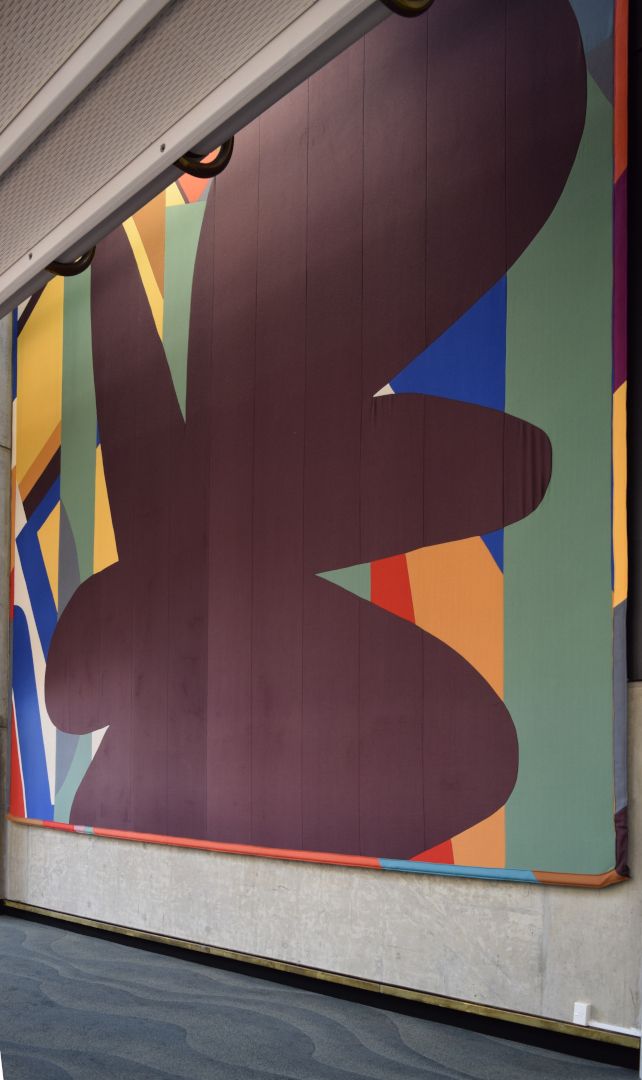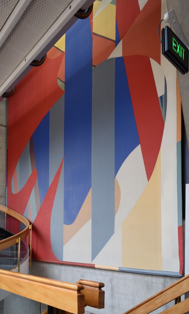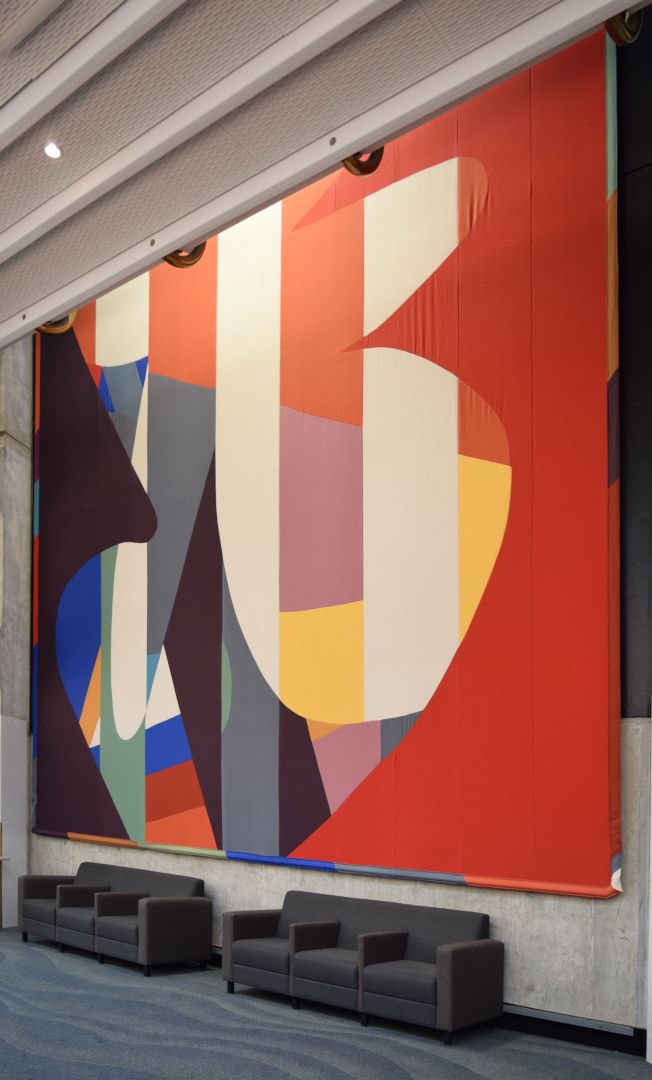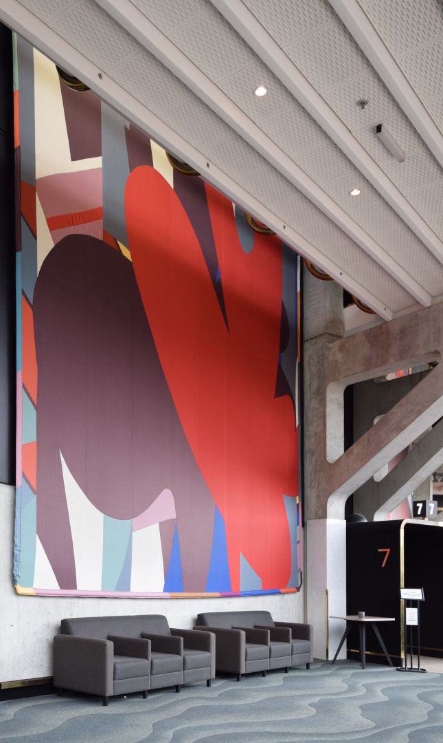 Ten playful and bright colourful abstract textile mural wall hangings, reminiscent of Mattisse’s cut-outs and Kandinsky’s style. Each work has been hung at ceiling height between each second-floor entrance to the main auditorium, and stretches across two levels, spanning both the first and second floors of the building.