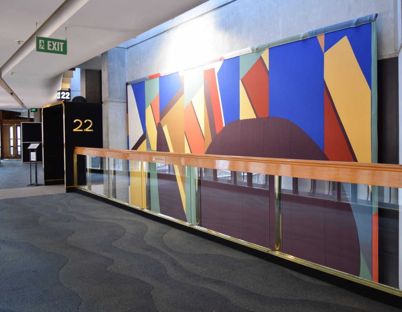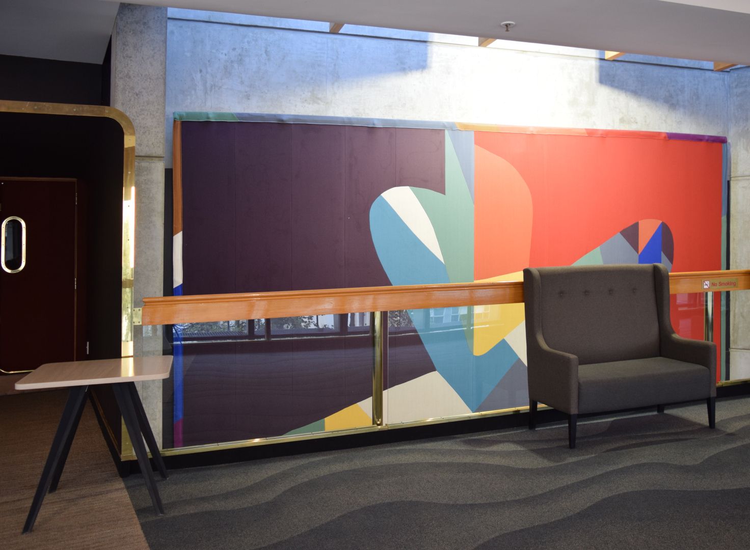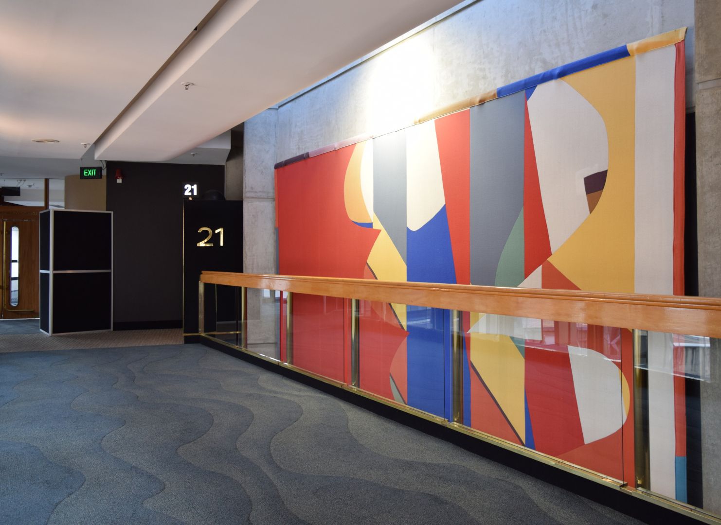 Ten playful and bright colourful abstract textile mural wall hangings, reminiscent of Mattisse’s cut-outs and Kandinsky’s style. Each work has been hung at ceiling height between each second-floor entrance to the main auditorium, and stretches across two levels, spanning both the first and second floors of the building.
