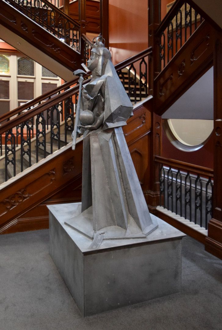 A re-visioning of the classic pose to represent Queen Victoria. She carries the orb and sceptre, and wears the crown. Largely fabricated in welded plate, and finished in zinc galvanising, the figure is very authorative even militant.
