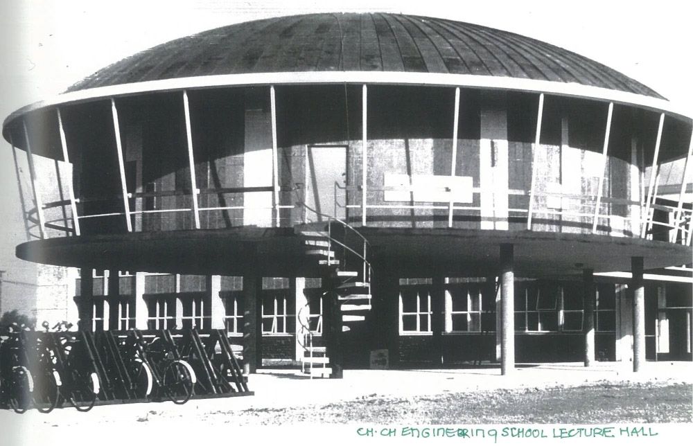 Fondly referred to as the ‘Mushroom’ due to its appearance, the iconic lecture theatre was one of the first buildings to appear on the Ilam campus. The design is attributed to emigre architect Helmut Einhorn. It was added to and modified several times during the years, and its copper roof gradually aged to verdigris.